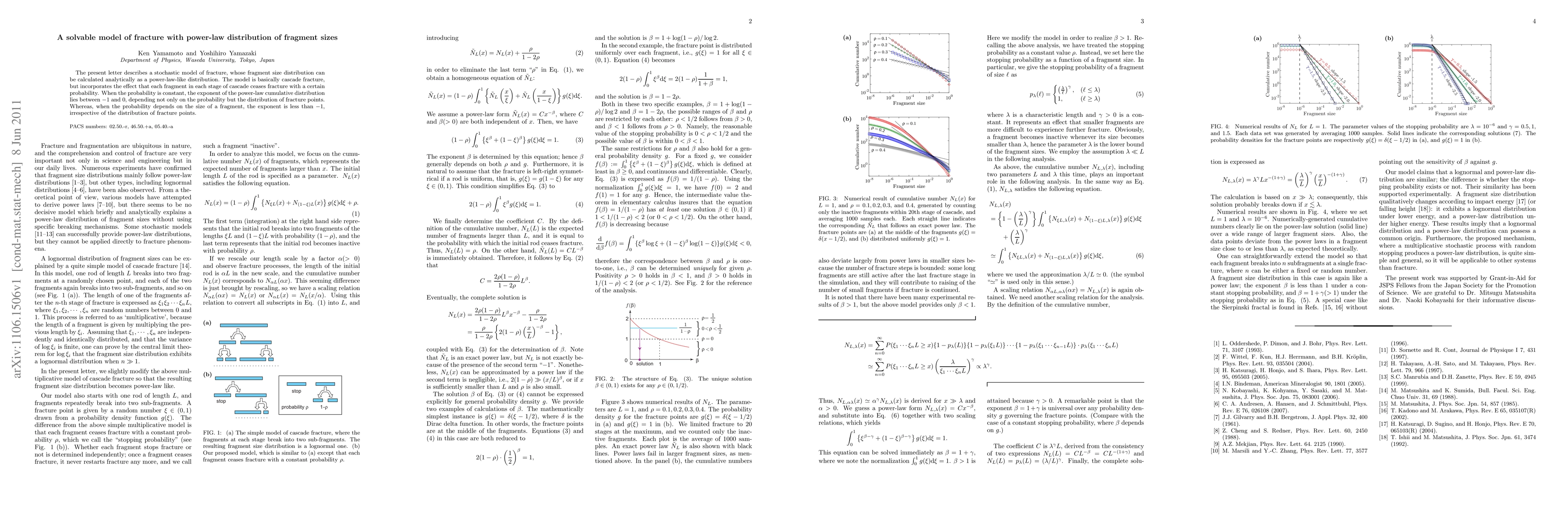 A new model of fracture predicts a power-law distribution of fragment sizes, with varying exponents based on probabilities and fragment size, offering insights into the complex process of fracture in materials.