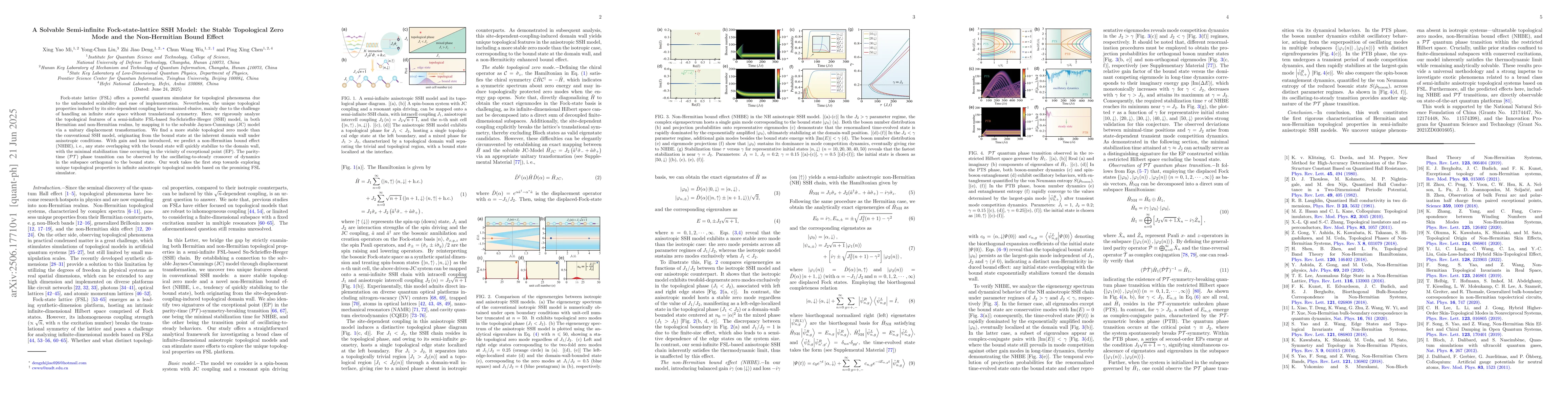 The research analyzes a semi-infinite Fock-state lattice (FSL)-based Su-Schrieffer-Heeger (SSH) model, revealing a stable topological zero mode and a non-Hermitian bound effect (NHBE). By mapping the FSL to the solvable Jaynes-Cummings (JC) model, it finds a more stable zero mode at the inherent domain wall under anisotropic conditions. Gain and loss introduction predicts states stabilizing quickly to the domain wall, with minimal time near exceptional points, also exhibiting paritytime (PT) phase transition.