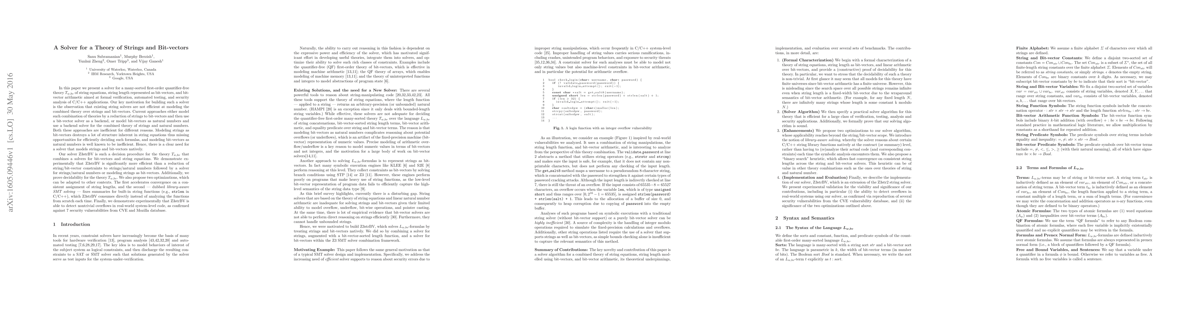 We present a solver for a many-sorted first-order quantifier-free theory $T_{w,bv}$ of string equations, string length represented as bit-vectors, and bit-vector arithmetic aimed at formal verification, automated testing, and security analysis of C/C++ applications. Our key motivation for building such a solver is the observation that existing string solvers are not efficient at modeling the string/bit-vector combination. Current approaches either reduce strings to bit-vectors and use a bit-vector solver as a backend, or model bit-vectors as natural numbers and use a solver for the combined theory of strings and natural numbers. Both these approaches are inefficient for different reasons. Modeling strings as bit-vectors destroys structure inherent in string equations thus missing opportunities for efficiently deciding such formulas, and modeling bit-vectors as natural numbers is known to be inefficient. Hence, there is a clear need for a solver that models strings and bit-vectors natively. Our solver Z3strBV is a decision procedure for the theory $T_{w,bv}$ combining solvers for bit-vector and string equations. We demonstrate experimentally that Z3strBV is significantly more efficient than reduction of string/bit-vector constraints to strings/natural numbers. Additionally, we prove decidability for the theory $T_{w,bv}$. We also propose two optimizations which can be adapted to other contexts. The first accelerates convergence on a consistent assignment of string lengths, and the second, dubbed library-aware SMT solving, fixes summaries for built-in string functions (e.g., {\tt strlen} in C/C++), which Z3strBV uses directly instead of analyzing the functions from scratch each time. Finally, we demonstrate experimentally that Z3strBV is able to detect nontrivial overflows in real-world system-level code, as confirmed against 7 security vulnerabilities from CVE and Mozilla database.