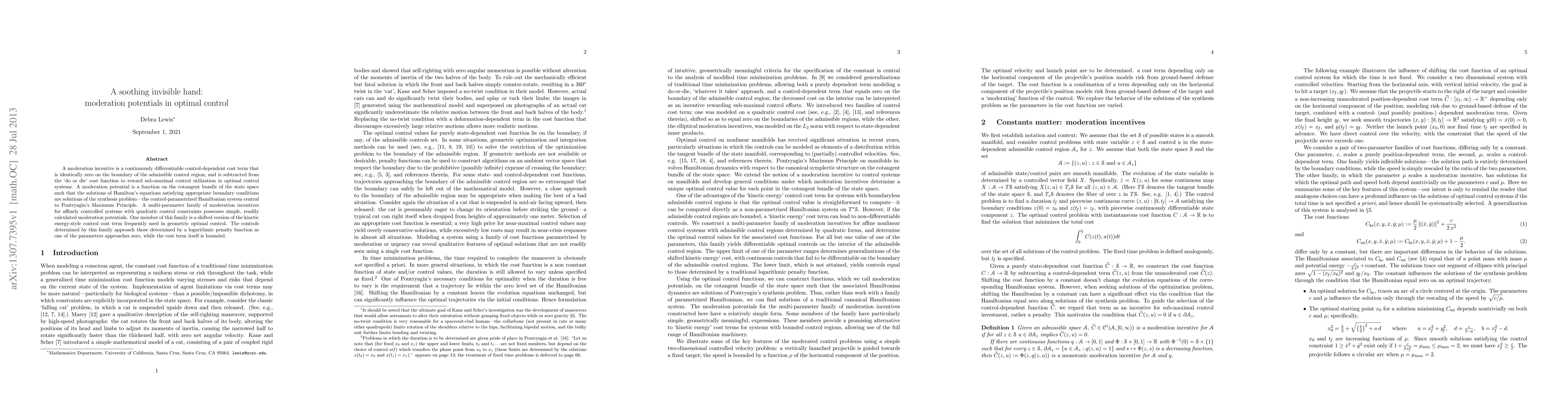 A moderation incentive is a continuously differentiable control-dependent cost term that is identically zero on the boundary of the admissible control region, and is subtracted from the `do or die' cost function to reward sub-maximal control utilization in optimal control systems. A moderation potential is a function on the cotangent bundle of the state space such that the solutions of Hamilton's equations satisfying appropriate boundary conditions are solutions of the synthesis problem - the control-parametrized Hamiltonian system central to Pontryagin's Maximum Principle. A multi-parameter family of moderation incentives for affinely controlled systems with quadratic control constraints possesses simple, readily calculated moderation potentials. One member of this family is a shifted version of the kinetic energy-style control cost term frequently used in geometric optimal control. The controls determined by this family approach those determined by a logarithmic penalty function as one of the parameters approaches zero, while the cost term itself is bounded.
