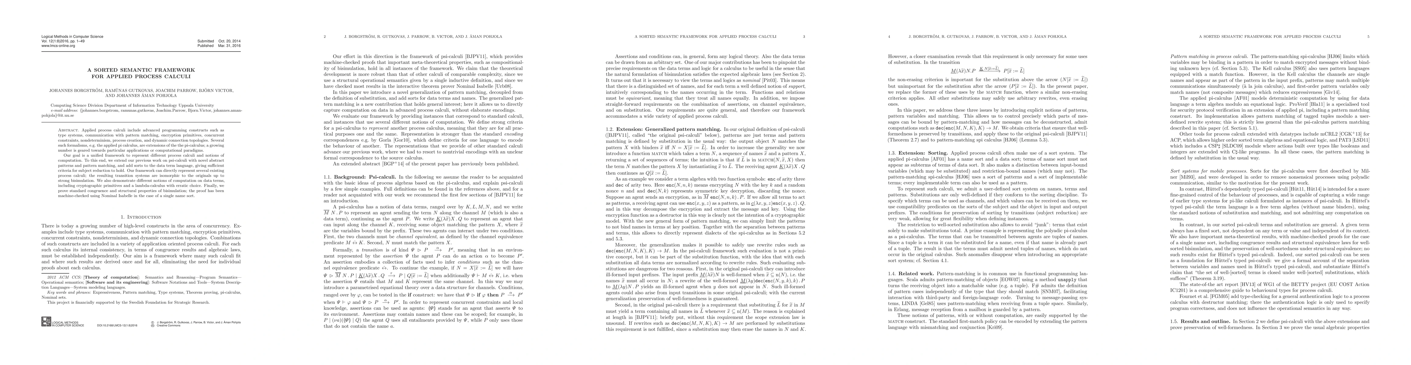 This paper proposes a sorted semantic framework for applied process calculi, integrating advanced constructs like type systems and encryption. It extends previous work with abstract patterns and sorts, ensuring subject reduction and representing existing calculi isomorphically.