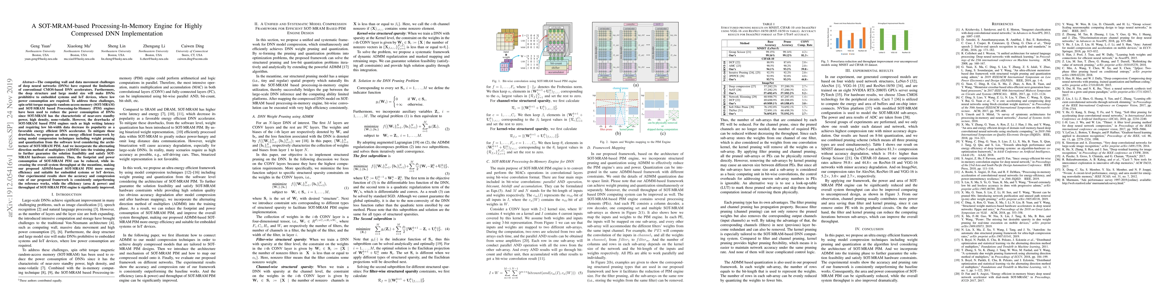This paper proposes an energy-efficient SOT-MRAM-based Processing-In-Memory (PIM) engine for deep neural networks (DNNs) using model compression techniques and the ADMM algorithm to address the high power consumption and latency issues of conventional DNN accelerators. The results show improved efficiency, throughput, and accuracy compared to existing methods.