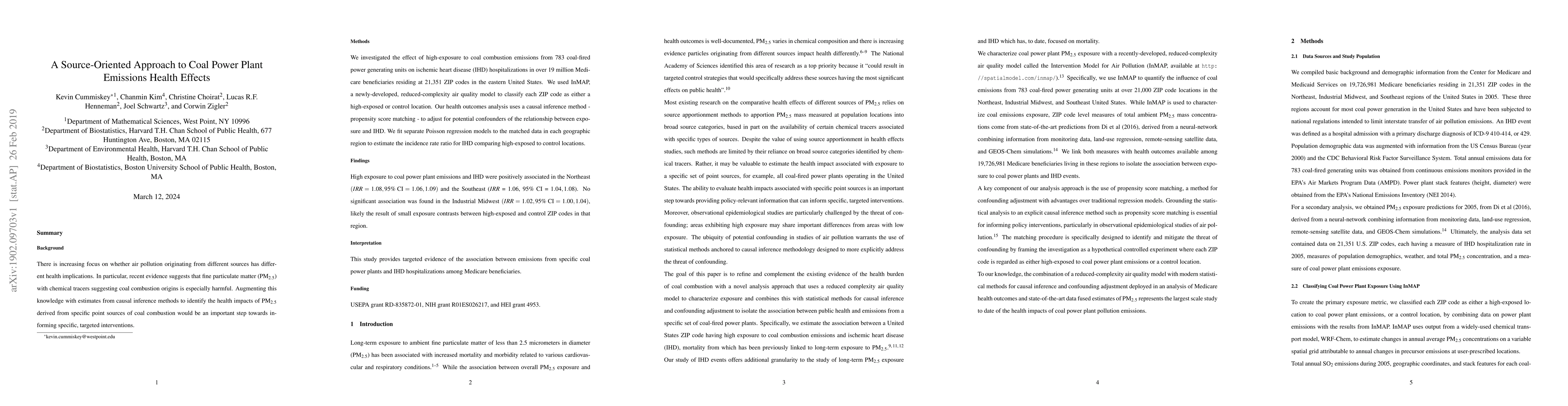 This study uses a source-oriented approach to determine the health effects of coal power plant emissions, finding a significant association between high exposure to coal combustion emissions and ischemic heart disease hospitalizations in Medicare beneficiaries in the Northeast and Southeast U.S., but not in the Industrial Midwest.