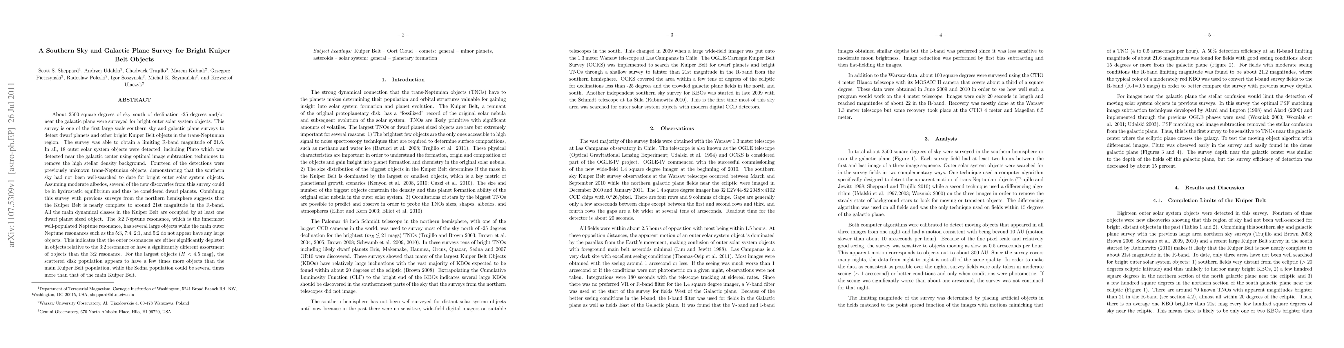 This survey of the southern sky and galactic plane detected 18 bright Kuiper Belt objects, including previously unknown trans-Neptunian objects and Pluto, suggesting the southern sky had been under-explored for such objects. The findings indicate the Kuiper Belt is nearly complete to 21st magnitude in the R-band, with the 3:2 Neptune resonance notably more populated than other outer resonances.
