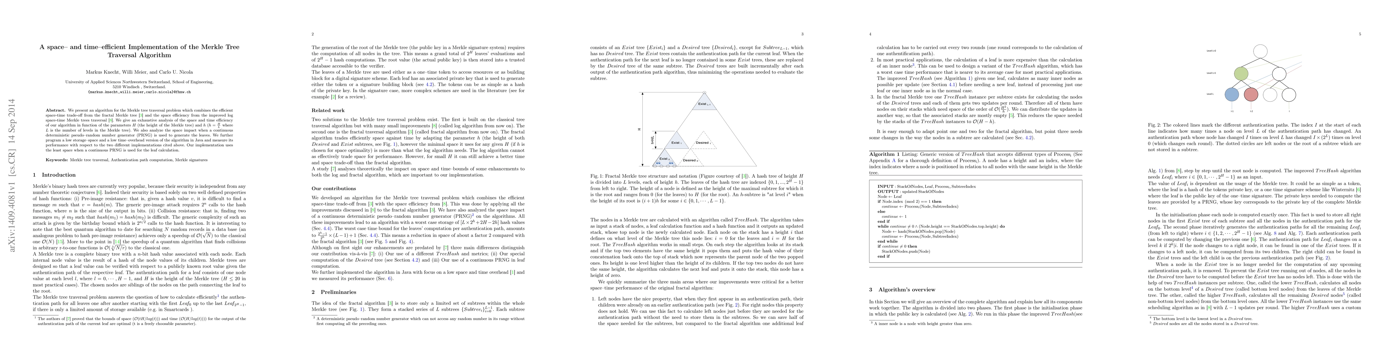We present an algorithm for the Merkle tree traversal problem which combines the efficient space-time trade-off from the fractal Merkle tree [3] and the space efficiency from the improved log space-time Merkle trees traversal [8]. We give an exhaustive analysis of the space and time efficiency of our algorithm in function of the parameters H (the height of the Merkle tree) and h (h = H L where L is the number of levels in the Merkle tree). We also analyze the space impact when a continuous deterministic pseudo-random number generator (PRNG) is used to generate the leaves. We further program a low storage-space and a low time-overhead version of the algorithm in Java and measure its performance with respect to the two different implementations cited above. Our implementation uses the least space when a continuous PRNG is used for the leaf calculation.