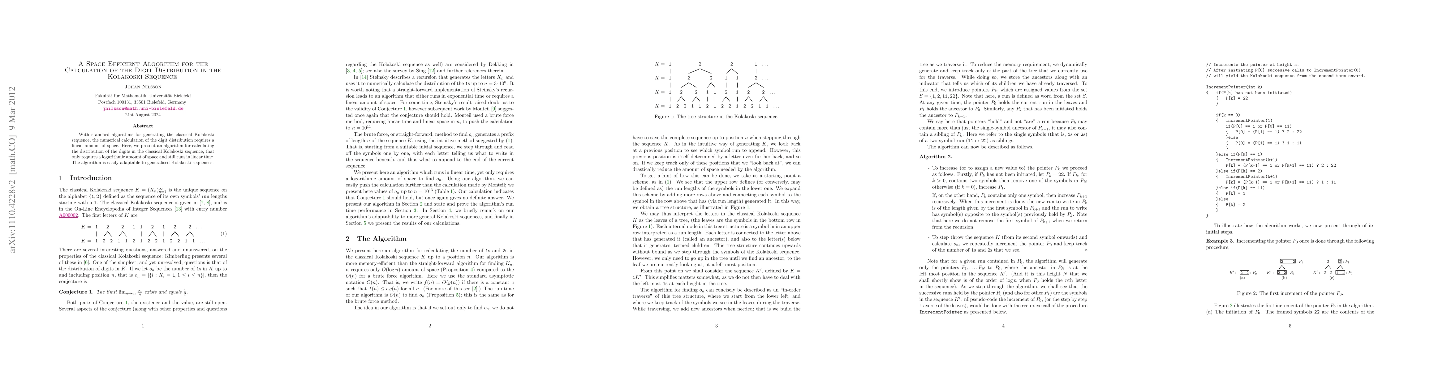 Researchers have developed an algorithm to calculate digit distribution in the Kolakoski sequence with logarithmic space complexity, making it more efficient than existing methods.