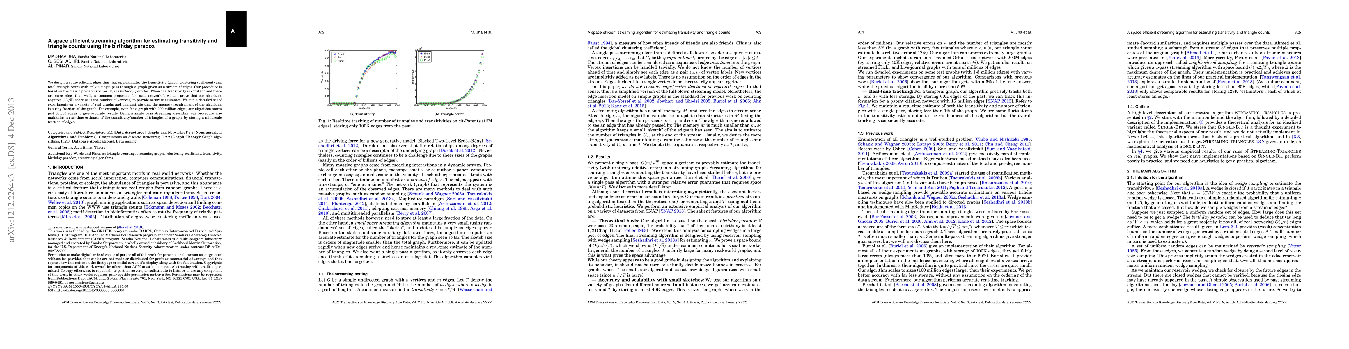 This paper presents a space-efficient streaming algorithm for estimating transitivity and total triangle count in graphs using the birthday paradox. The algorithm requires only $O(\sqrt{n})$ space for accurate estimates, demonstrating minimal memory usage even for large graphs.