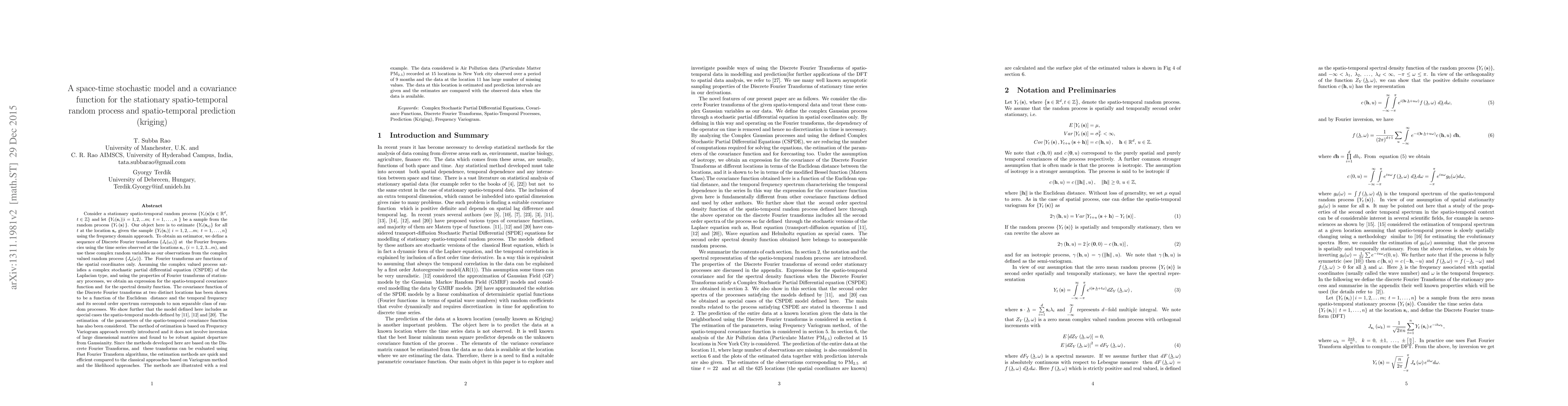 This paper develops a space-time covariance function for stationary spatio-temporal random processes, employing Discrete Fourier Transforms for spectral density estimation and kriging for spatio-temporal prediction. It introduces a non-separable class of covariance functions expressed in terms of modified Bessel functions and discusses parameter estimation and statistical tests for spatial independence.