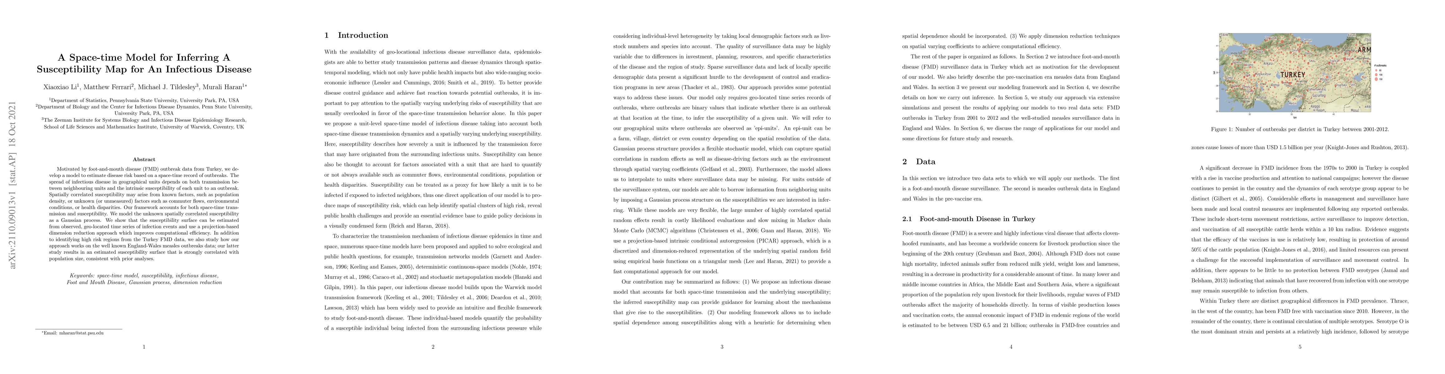 This paper develops a space-time model to infer susceptibility maps for infectious diseases, using foot-and-mouth disease data from Turkey and measles data from England-Wales. The model estimates disease risk by accounting for both spatial transmission and spatially correlated susceptibility, modeled as a Gaussian process.
