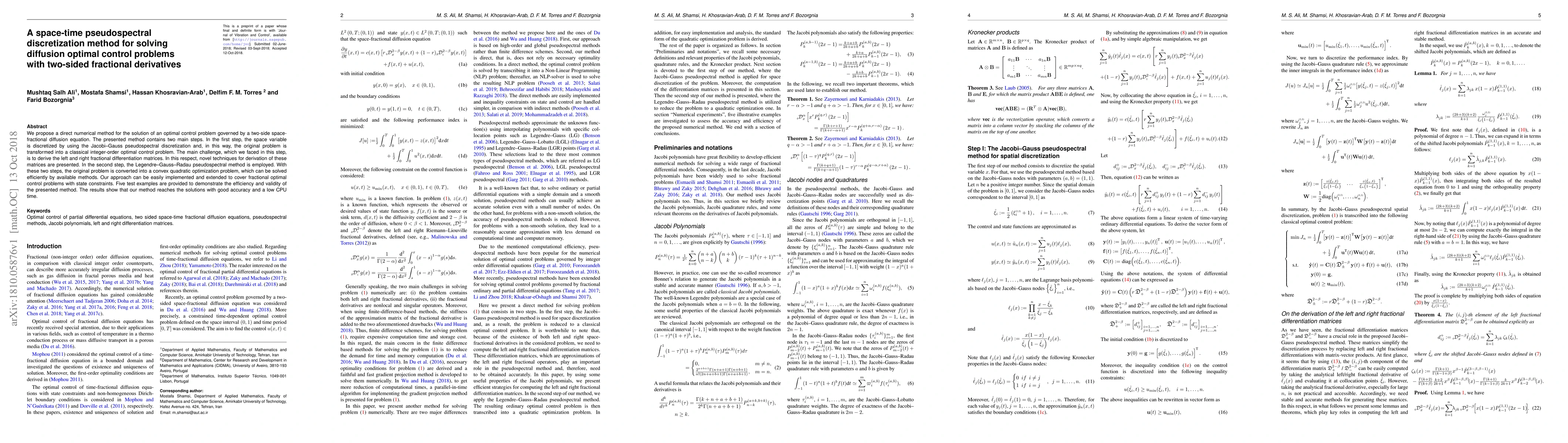 This paper proposes a space-time pseudospectral discretization method for solving optimal control problems involving two-sided fractional derivatives. The method transforms the problem into a classical integer-order optimal control problem using Jacobi-Gauss pseudospectral discretization, followed by a Legendre-Gauss-Radau pseudospectral approach, resulting in a convex quadratic optimization problem.