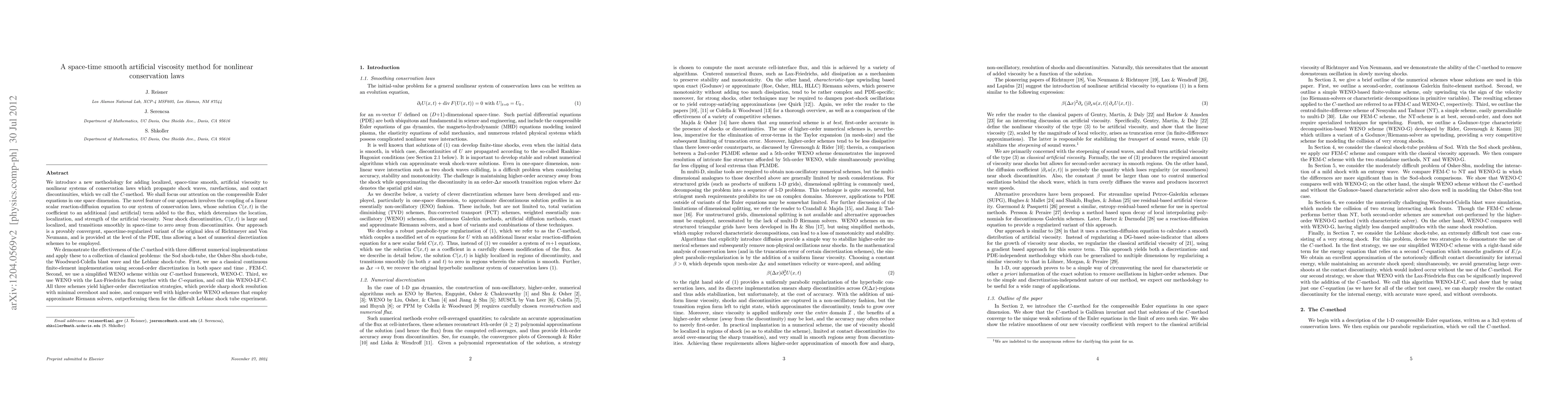 We introduce a new methodology for adding localized, space-time smooth, artificial viscosity to nonlinear systems of conservation laws which propagate shock waves, rarefactions, and contact discontinuities, which we call the $C$-method. We shall focus our attention on the compressible Euler equations in one space dimension. The novel feature of our approach involves the coupling of a linear scalar reaction-diffusion equation to our system of conservation laws, whose solution $C(x,t)$ is the coefficient to an additional (and artificial) term added to the flux, which determines the location, localization, and strength of the artificial viscosity. Near shock discontinuities, $C(x,t)$ is large and localized, and transitions smoothly in space-time to zero away from discontinuities. Our approach is a provably convergent, spacetime-regularized variant of the original idea of Richtmeyer and Von Neumann, and is provided at the level of the PDE, thus allowing a host of numerical discretization schemes to be employed. We demonstrate the effectiveness of the $C$-method with three different numerical implementations and apply these to a collection of classical problems: the Sod shock-tube, the Osher-Shu shock-tube, the Woodward-Colella blast wave and the Leblanc shock-tube. First, we use a classical continuous finite-element implementation using second-order discretization in both space and time, FEM-C. Second, we use a simplified WENO scheme within our $C$-method framework, WENO-C. Third, we use WENO with the Lax-Friedrichs flux together with the $C$-equation, and call this WENO-LF-C. All three schemes yield higher-order discretization strategies, which provide sharp shock resolution with minimal overshoot and noise, and compare well with higher-order WENO schemes that employ approximate Riemann solvers, outperforming them for the difficult Leblanc shock tube experiment.