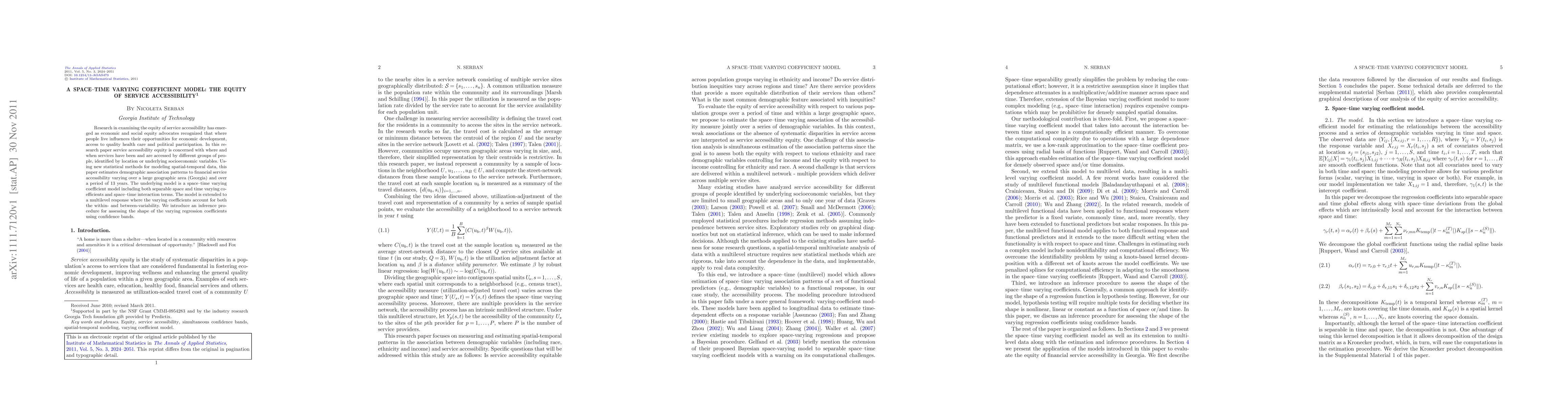This paper develops a space-time varying coefficient model to assess equity in service accessibility across different demographic groups in Georgia over 13 years. It employs advanced statistical methods to estimate patterns and interactions in financial service access, incorporating both spatial and temporal variations.