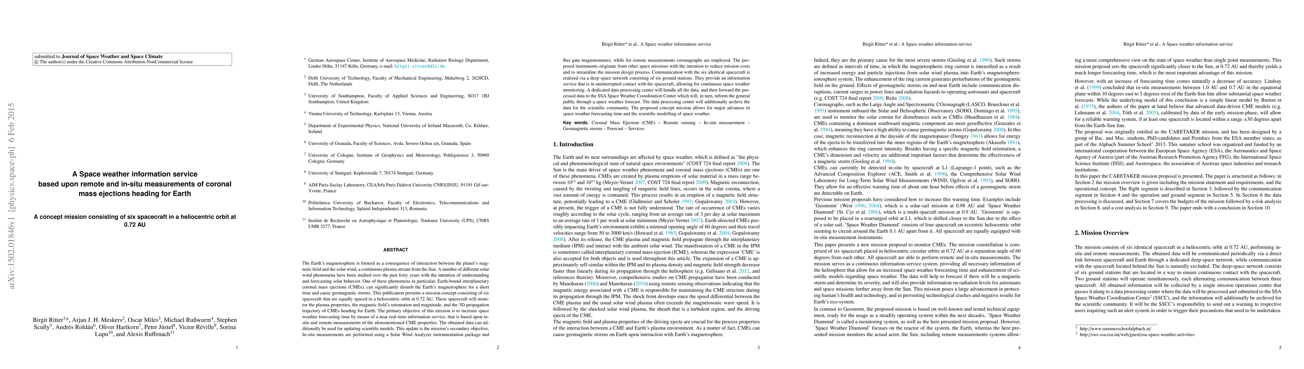 This paper presents a mission concept for six spacecraft to monitor coronal mass ejections (CMEs) heading for Earth, aiming to enhance space weather forecasting through real-time in-situ and remote measurements. The mission seeks to increase forecasting lead time and provide data for scientific models, utilizing a dedicated processing center and ground stations for continuous monitoring and data management.