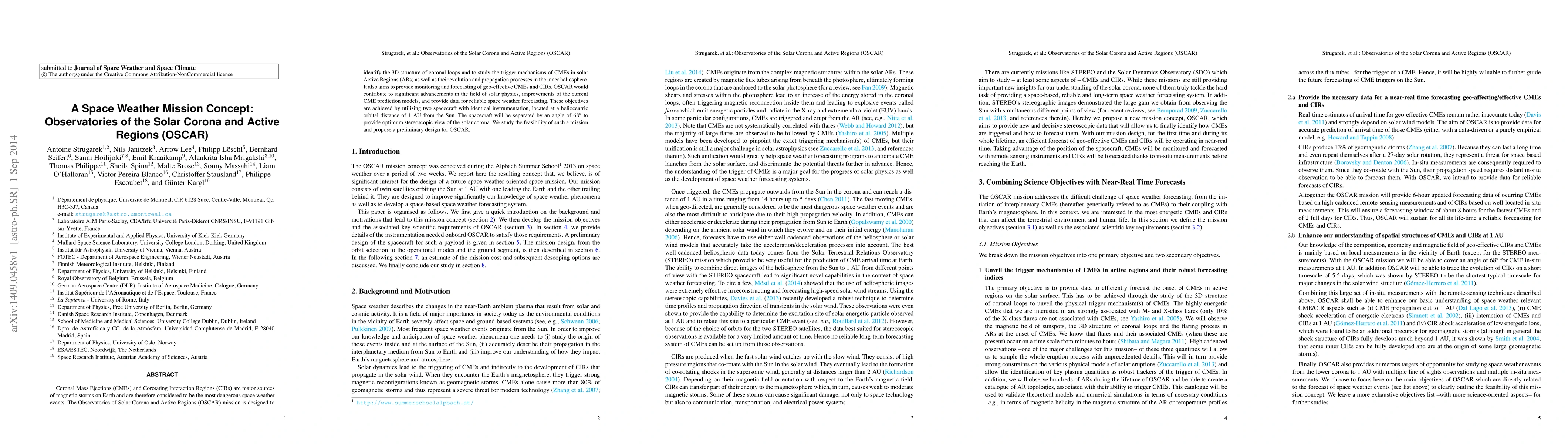 The OSCAR mission aims to study coronal mass ejections and magnetic storms on Earth by observing the solar corona with two spacecraft separated by a 68-degree angle, providing critical data for space weather forecasting.