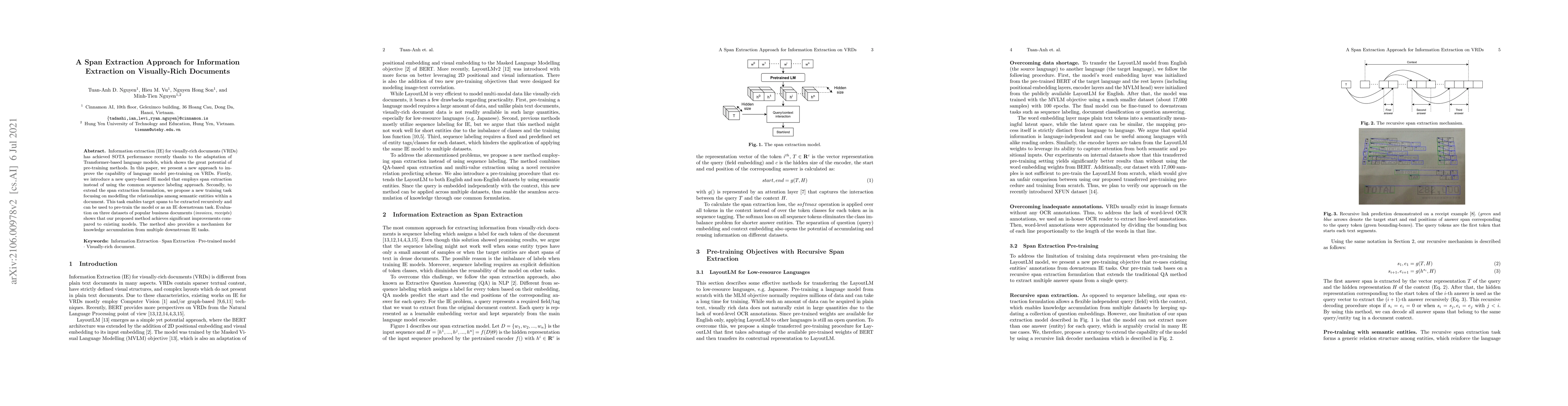 This paper introduces a span extraction approach for information extraction in visually-rich documents, employing a query-based model that outperforms sequence labeling. It also proposes a new training task to model relationships among semantic entities, achieving significant improvements over existing models on business document datasets.