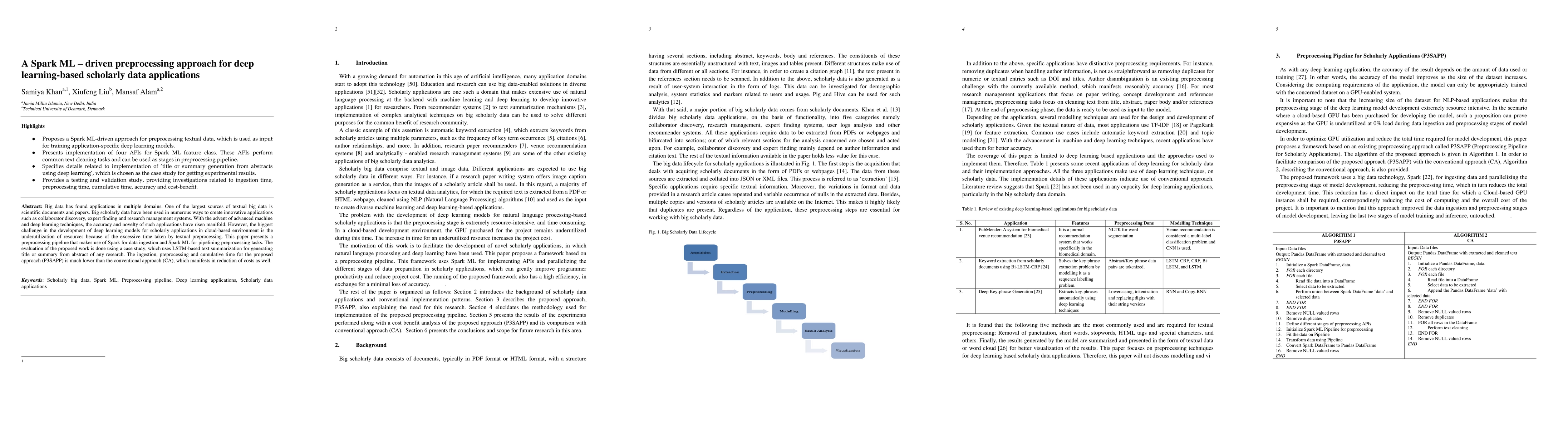 This paper presents a Spark ML driven preprocessing approach to reduce time in deep learning applications for scholarly data, resulting in lower costs and faster processing times.