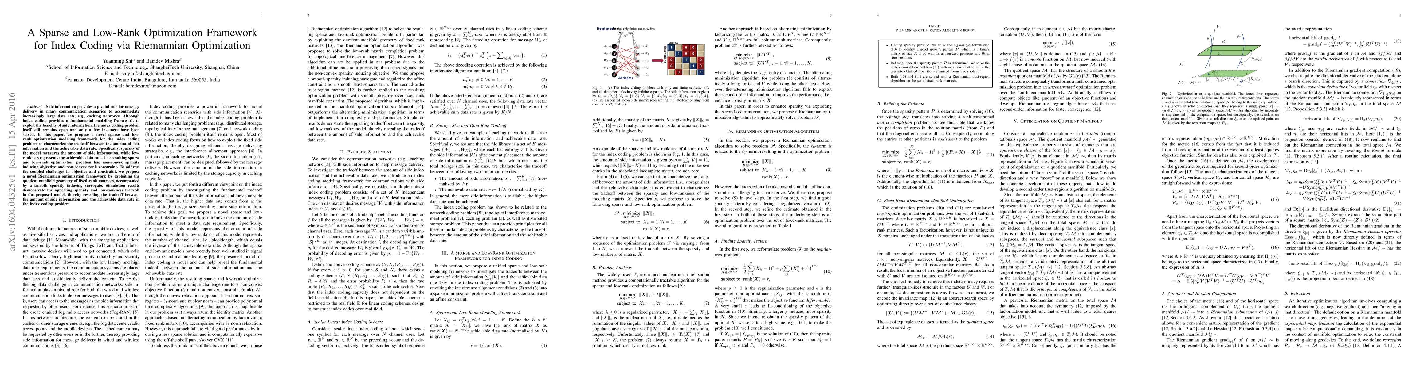 This paper proposes a novel sparse and low-rank optimization framework for the index coding problem using Riemannian optimization to characterize the tradeoff between side information and data rate. The framework leverages quotient manifold geometry and a smooth surrogate to address non-convex sparsity and rank constraints.