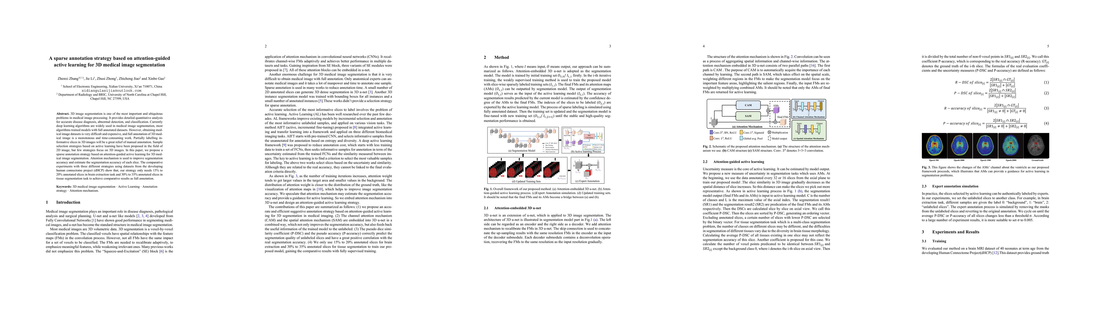 This paper proposes an attention-guided active learning strategy for sparse annotation in 3D medical image segmentation, significantly reducing the need for full dataset annotation. Experiments demonstrate that only 15-20% annotated slices for brain extraction and 30-35% for tissue segmentation yield results comparable to fully annotated datasets.