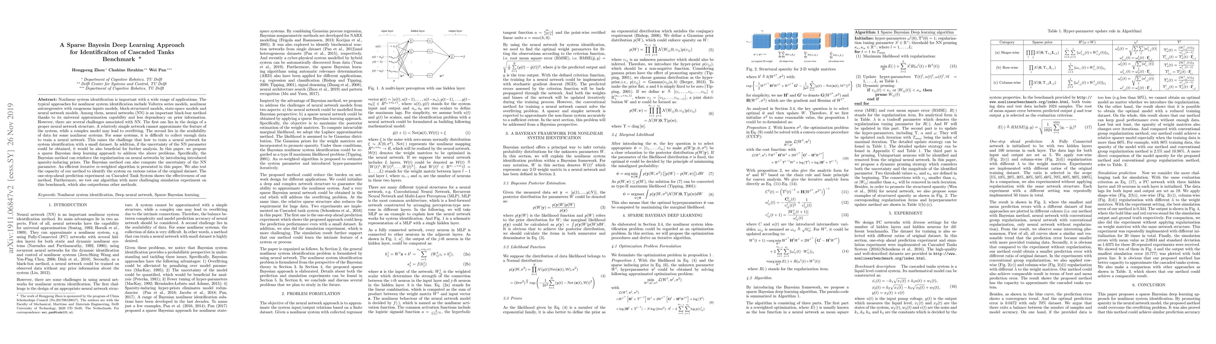 This paper proposes a sparse Bayesian deep learning approach to identify nonlinear systems, specifically addressing the Cascaded Tanks Benchmark. The method incorporates sparsity-inducing priors to mitigate overfitting and compute uncertainty, demonstrating superior performance in system identification with limited datasets.
