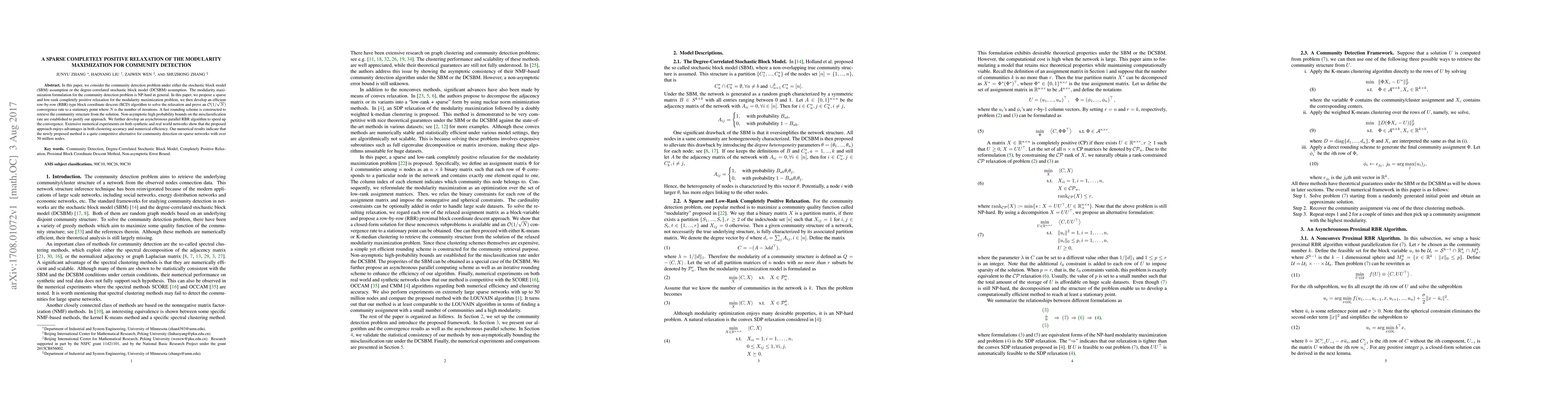 In this paper, we consider the community detection problem under either the stochastic block model (SBM) assumption or the degree-correlated stochastic block model (DCSBM) assumption. The modularity maximization formulation for the community detection problem is NP-hard in general. In this paper, we propose a sparse and low-rank completely positive relaxation for the modularity maximization problem, we then develop an efficient row-by-row (RBR) type block coordinate descent (BCD) algorithm to solve the relaxation and prove an $\mathcal{O}(1/\sqrt{N})$ convergence rate to a stationary point where $N$ is the number of iterations. A fast rounding scheme is constructed to retrieve the community structure from the solution. Non-asymptotic high probability bounds on the misclassification rate are established to justify our approach. We further develop an asynchronous parallel RBR algorithm to speed up the convergence. Extensive numerical experiments on both synthetic and real world networks show that the proposed approach enjoys advantages in both clustering accuracy and numerical efficiency. Our numerical results indicate that the newly proposed method is a quite competitive alternative for community detection on sparse networks with over 50 million nodes.