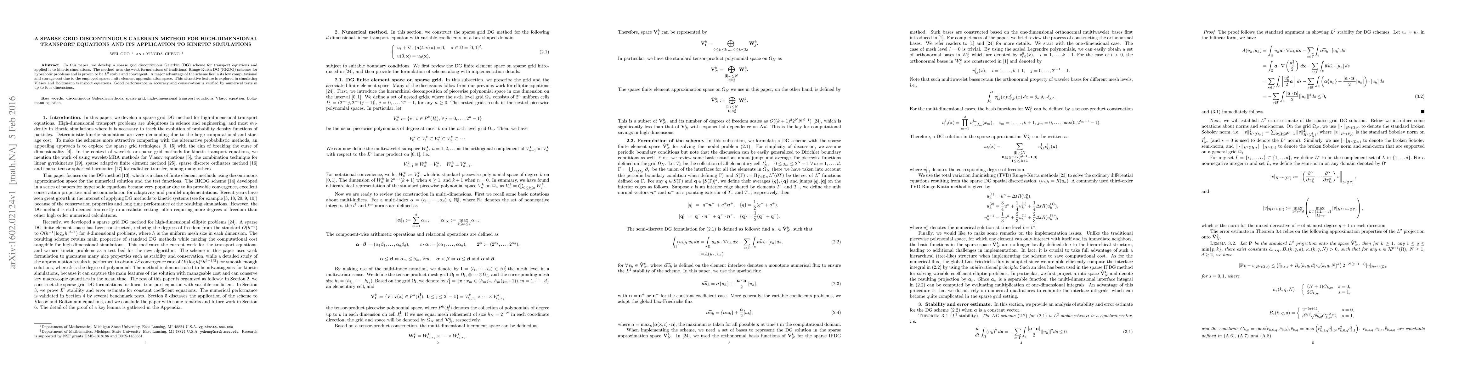 This paper introduces a sparse grid discontinuous Galerkin method for solving high-dimensional transport equations, demonstrating its application in kinetic simulations. The method is shown to be $L^2$ stable and convergent, with notable efficiency due to sparse finite element approximation.
