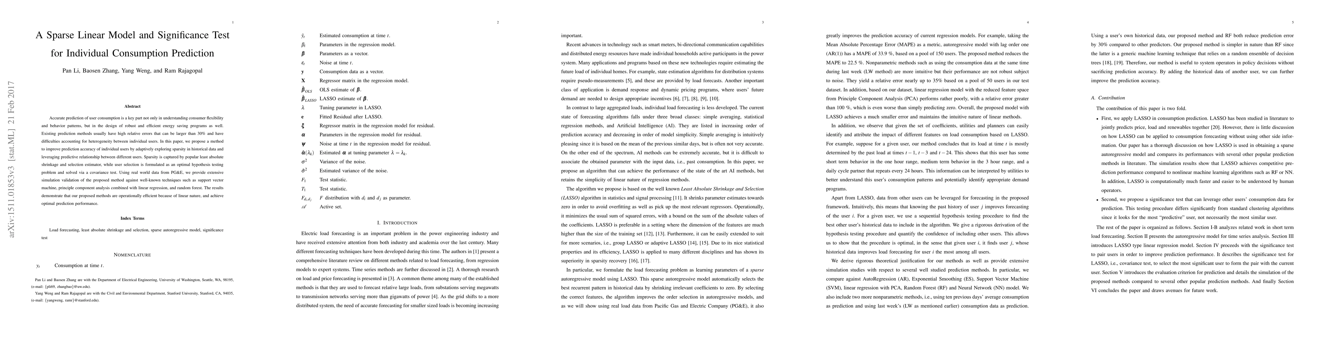 Accurate prediction of user consumption is a key part not only in understanding consumer flexibility and behavior patterns, but in the design of robust and efficient energy saving programs as well. Existing prediction methods usually have high relative errors that can be larger than 30% and have difficulties accounting for heterogeneity between individual users. In this paper, we propose a method to improve prediction accuracy of individual users by adaptively exploring sparsity in historical data and leveraging predictive relationship between different users. Sparsity is captured by popular least absolute shrinkage and selection estimator, while user selection is formulated as an optimal hypothesis testing problem and solved via a covariance test. Using real world data from PG&E, we provide extensive simulation validation of the proposed method against well-known techniques such as support vector machine, principle component analysis combined with linear regression, and random forest. The results demonstrate that our proposed methods are operationally efficient because of linear nature, and achieve optimal prediction performance.