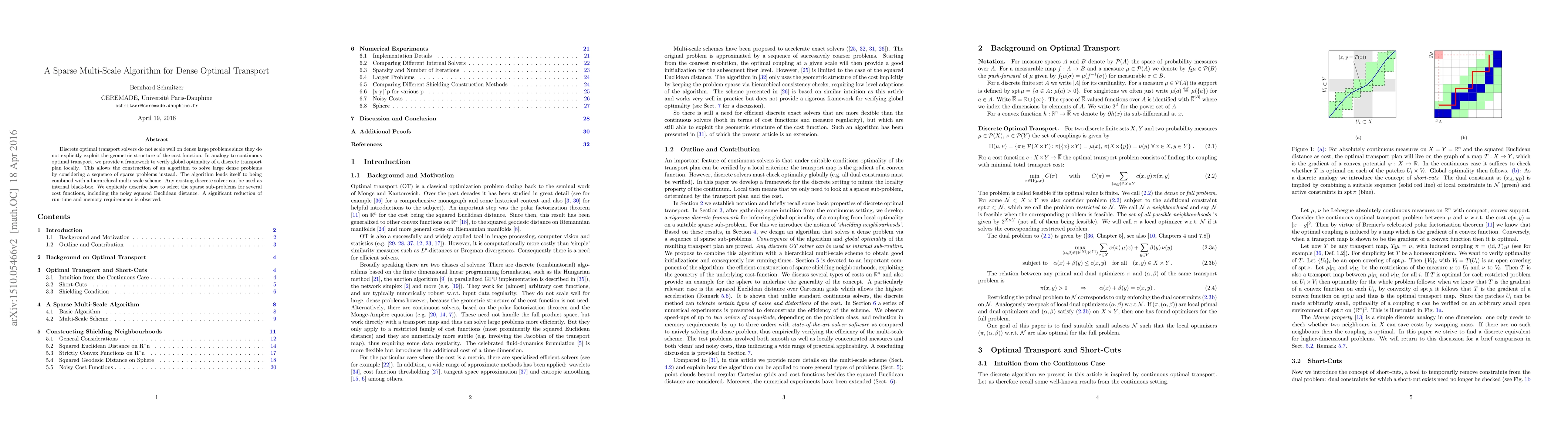 This paper proposes a sparse multi-scale algorithm for solving dense optimal transport problems efficiently by leveraging local optimality verification and a sequence of sparse problems. The method significantly reduces runtime and memory usage compared to traditional discrete solvers.