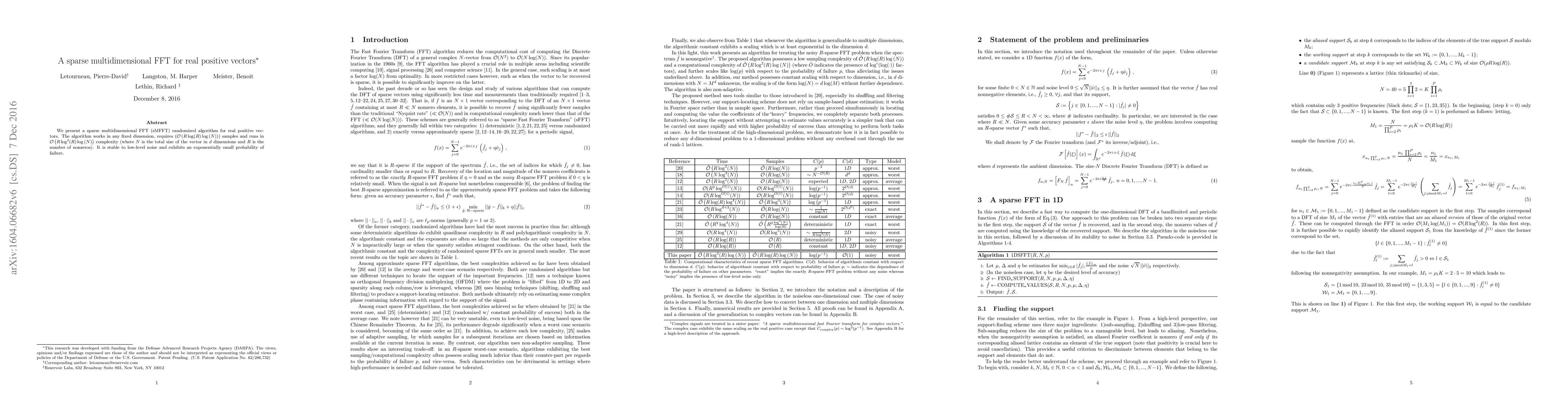 This paper introduces a randomized sparse multidimensional FFT (sMFFT) algorithm for real positive vectors, achieving O(R log(R) log(N)) sample complexity and O(R log^2(R) log(N)) runtime, where R is the number of nonzeros and N is the vector size in d dimensions. The algorithm is robust to low-level noise and has a low failure probability.