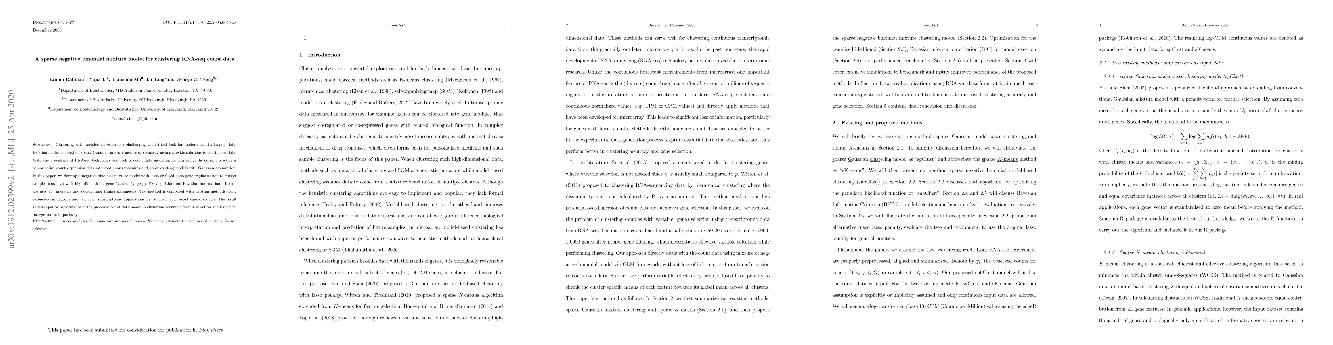 This paper proposes a sparse negative binomial mixture model for clustering RNA-seq count data, addressing the lack of appropriate methods for high-dimensional gene features. The method uses lasso or fused lasso regularization, EM algorithm, and Bayesian information criterion, and outperforms existing methods in clustering accuracy, feature selection, and biological interpretation.