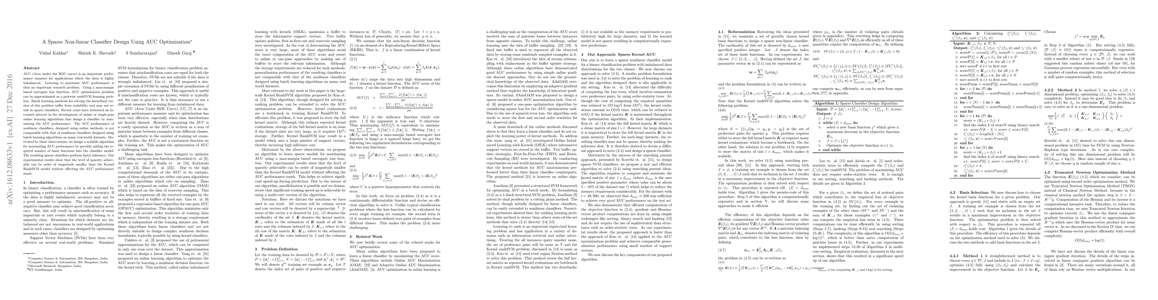 This paper proposes a scalable online learning algorithm to design sparse nonlinear classifiers that maximize AUC performance, achieving significant sparsity compared to kernel-based methods without substantially compromising performance. Experimental results demonstrate the effectiveness of the proposed method on real-world imbalanced datasets.