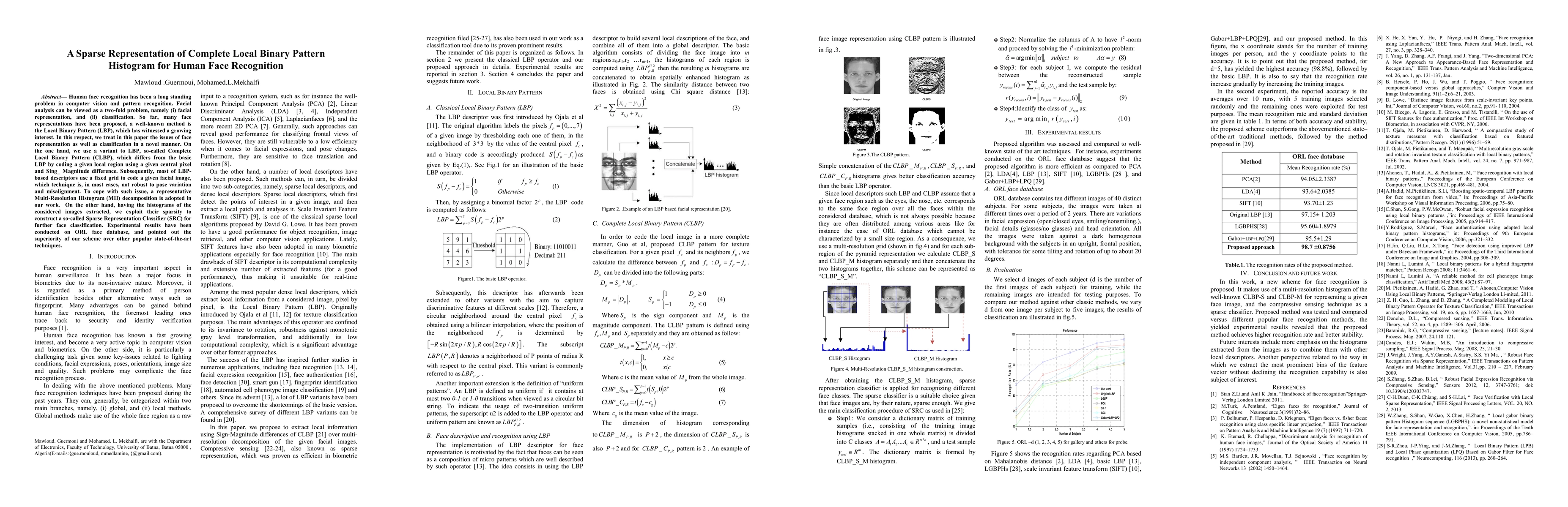 Human face recognition has been a long standing problem in computer vision and pattern recognition. Facial analysis can be viewed as a two-fold problem, namely (i) facial representation, and (ii) classification. So far, many face representations have been proposed, a well-known method is the Local Binary Pattern (LBP), which has witnessed a growing interest. In this respect, we treat in this paper the issues of face representation as well as classification in a novel manner. On the one hand, we use a variant to LBP, so-called Complete Local Binary Pattern (CLBP), which differs from the basic LBP by coding a given local region using a given central pixel and Sing_ Magnitude difference. Subsequently, most of LBPbased descriptors use a fixed grid to code a given facial image, which technique is, in most cases, not robust to pose variation and misalignment. To cope with such issue, a representative Multi-Resolution Histogram (MH) decomposition is adopted in our work. On the other hand, having the histograms of the considered images extracted, we exploit their sparsity to construct a so-called Sparse Representation Classifier (SRC) for further face classification. Experimental results have been conducted on ORL face database, and pointed out the superiority of our scheme over other popular state-of-the-art techniques.