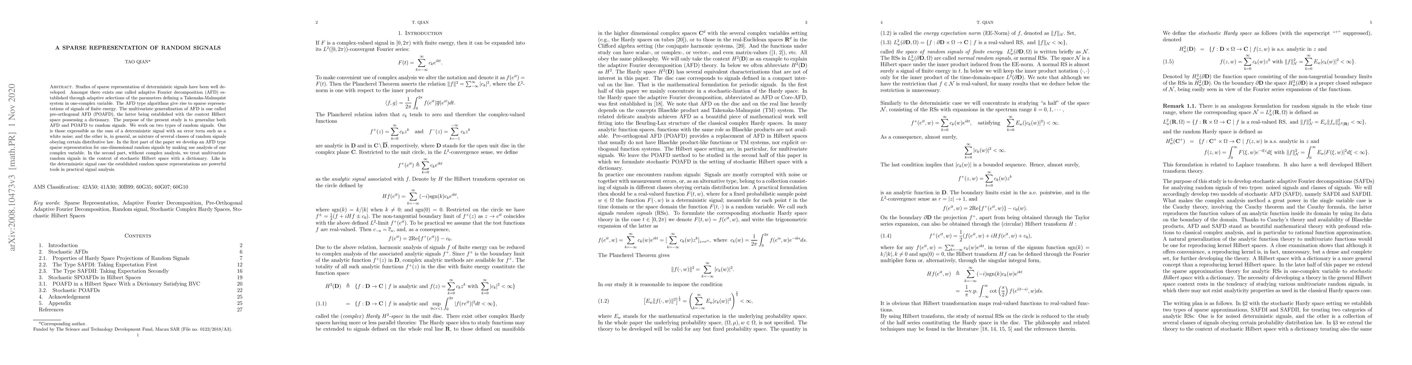 Studies of sparse representation of deterministic signals have been well developed. Amongst there exists one called adaptive Fourier decomposition (AFD) established through adaptive selections of the parameters defining a Takenaka-Malmquist system in one-complex variable. The AFD type algorithms give rise to sparse representations of signals of finite energy. The multivariate generalization of AFD is one called pre-orthogonal AFD (POAFD), the latter being established with the context Hilbert space possessing a dictionary. The purpose of the present study is to generalize both AFD and POAFD to random signals. We work on two types of random signals. One is those expressible as the sum of a deterministic signal with an error term such as a white noise; and the other is, in general, as mixture of several classes of random signals obeying certain distributive law. In the first part of the paper we develop an AFD type sparse representation for one-dimensional random signals by making use analysis of one complex variable. In the second part, without complex analysis, we treat multivariate random signals in the context of stochastic Hilbert space with a dictionary. Like in the deterministic signal case the established random sparse representations are powerful tools in practical signal analysis.