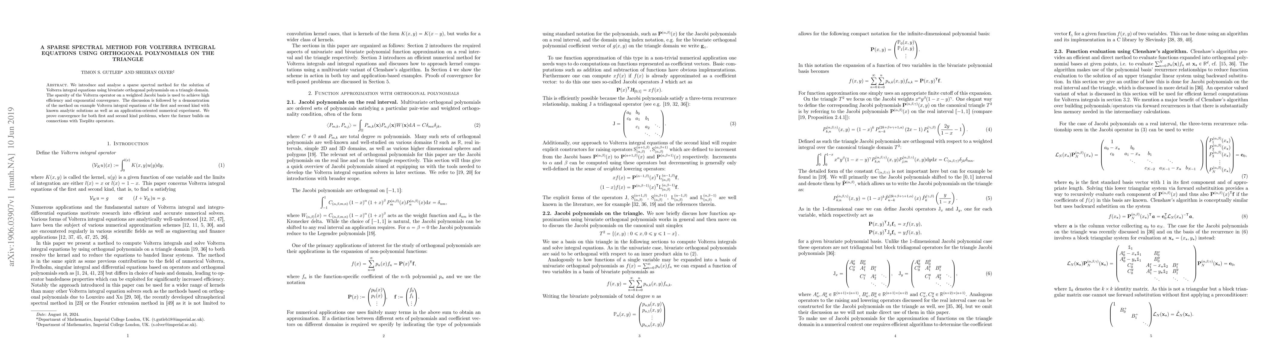 We introduce and analyse a sparse spectral method for the solution of Volterra integral equations using bivariate orthogonal polynomials on a triangle domain. The sparsity of the Volterra operator on a weighted Jacobi basis is used to achieve high efficiency and exponential convergence. The discussion is followed by a demonstration of the method on example Volterra integral equations of the first and second kind with known analytic solutions as well as an application-oriented numerical experiment. We prove convergence for both first and second kind problems, where the former builds on connections with Toeplitz operators.