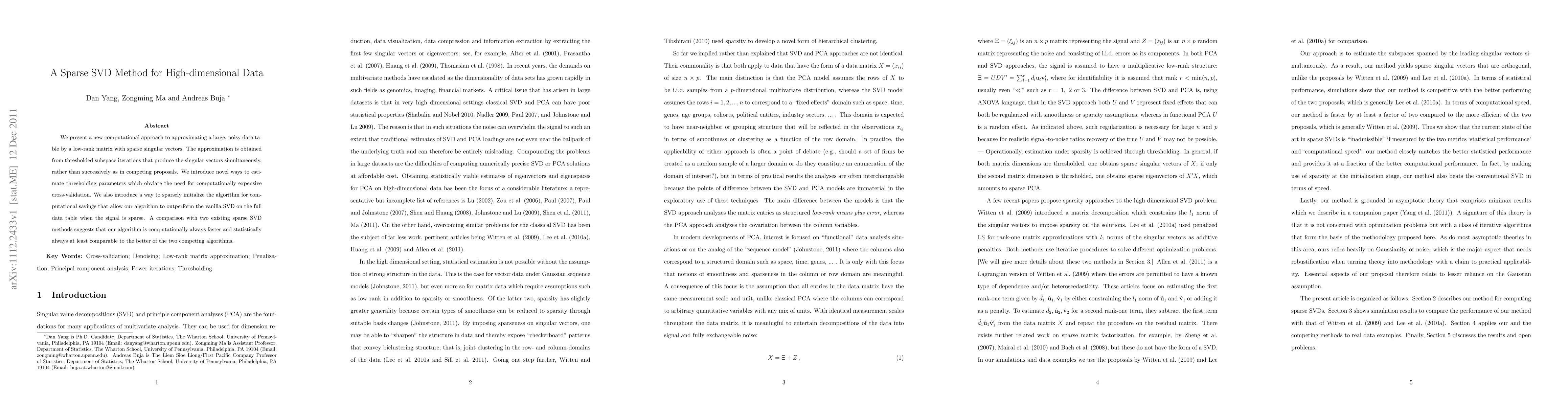 This paper proposes a novel sparse SVD method for approximating large, noisy data tables by low-rank matrices with sparse singular vectors, utilizing thresholded subspace iterations and sparse initialization for computational efficiency. The method outperforms traditional SVD and is faster and at least as effective as existing sparse SVD techniques.