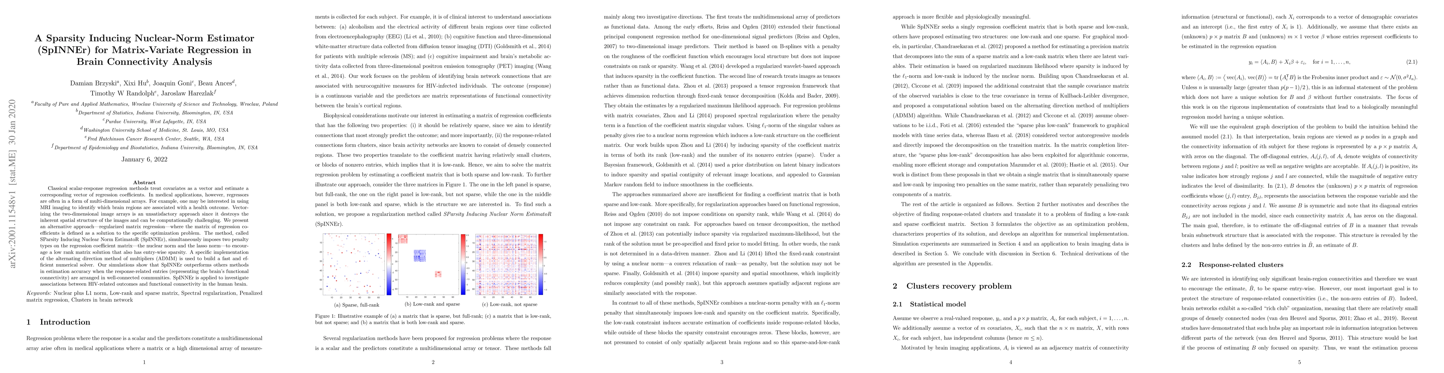 The paper proposes SpINNEr, a novel regularized matrix regression method for brain connectivity analysis that uses nuclear and lasso norms to achieve low-rank and sparse solutions. Simulations demonstrate SpINNEr's superior accuracy in estimating functional connectivity compared to other methods.