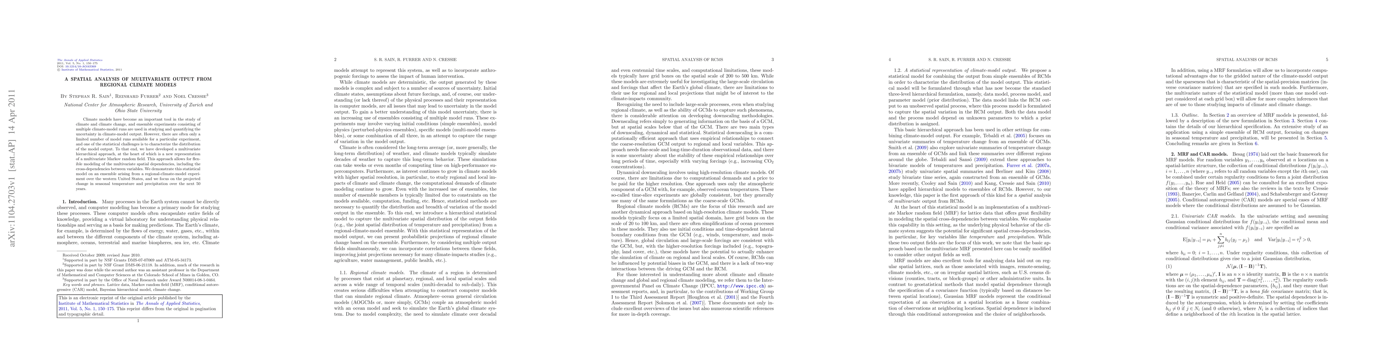 This paper develops a multivariate hierarchical model based on a Markov random field to analyze spatial dependencies in climate model outputs from regional experiments. The approach is demonstrated on a regional climate model ensemble over the western U.S., focusing on projected changes in temperature and precipitation over the next 50 years.