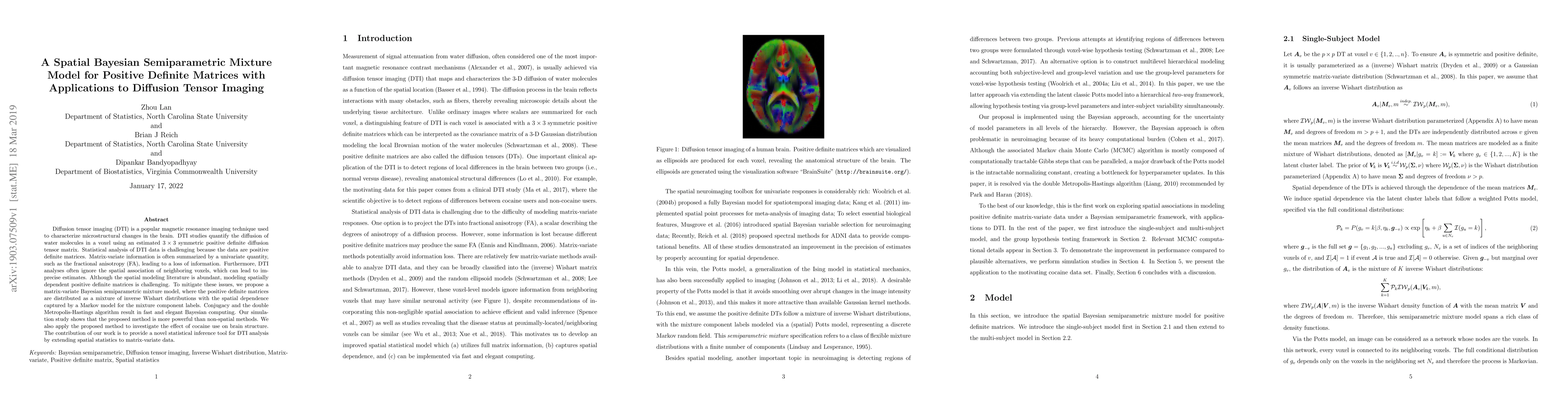 This paper proposes a spatial Bayesian semiparametric mixture model for analyzing positive definite matrices in diffusion tensor imaging (DTI) data, capturing the spatial dependence of voxels and preserving matrix-variate information. The method outperforms non-spatial approaches and is applied to study the effects of cocaine use on brain structure.
