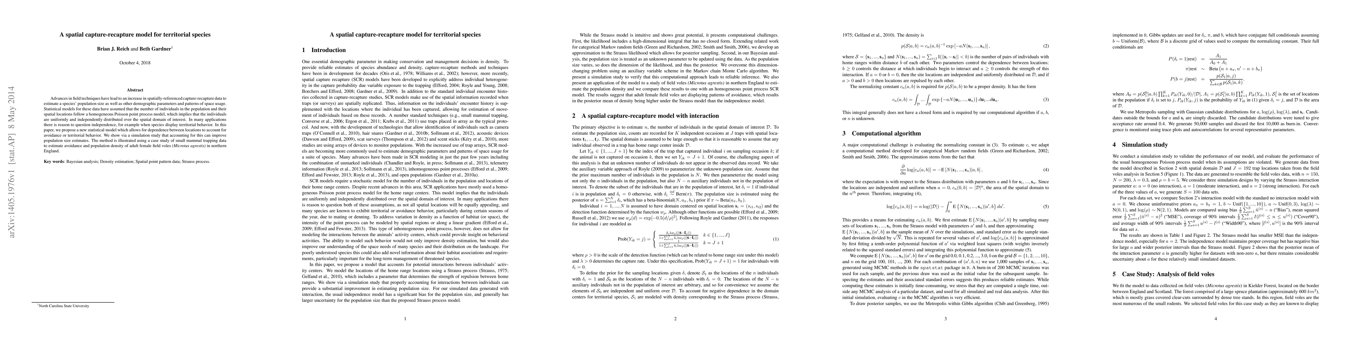 This paper proposes a spatial capture-recapture model that accounts for territorial behavior by allowing for dependence between individuals' locations, improving population size estimates. The method is demonstrated through a case study on adult female field voles in northern England, showing enhanced understanding of avoidance and population density.