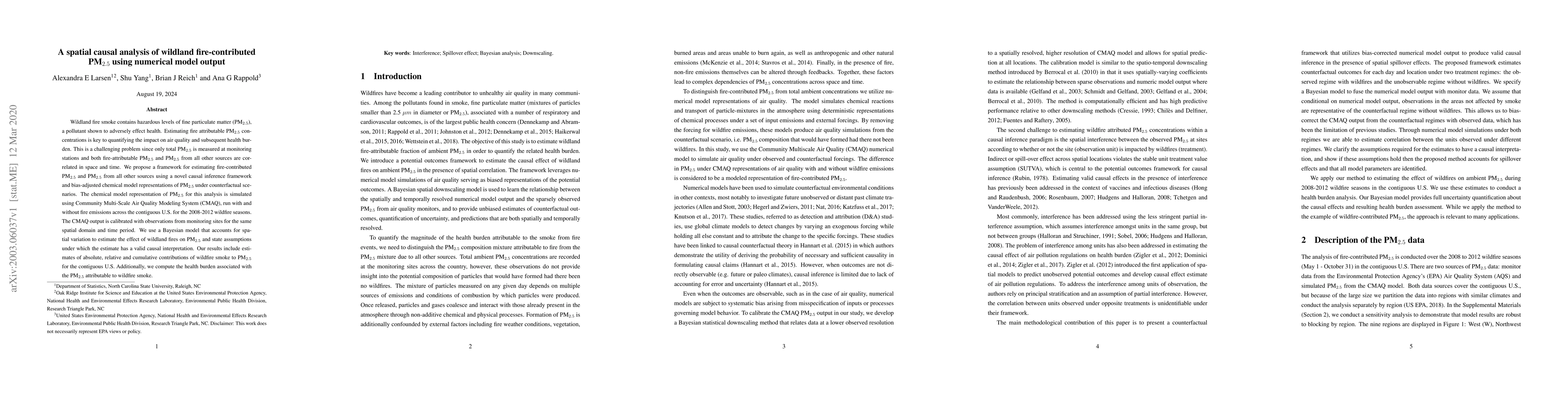 Wildland fire smoke contains hazardous levels of fine particulate matter PM2.5, a pollutant shown to adversely effect health. Estimating fire attributable PM2.5 concentrations is key to quantifying the impact on air quality and subsequent health burden. This is a challenging problem since only total PM2.5 is measured at monitoring stations and both fire-attributable PM2.5 and PM2.5 from all other sources are correlated in space and time. We propose a framework for estimating fire-contributed PM2.5 and PM2.5 from all other sources using a novel causal inference framework and bias-adjusted chemical model representations of PM2.5 under counterfactual scenarios. The chemical model representation of PM2.5 for this analysis is simulated using Community Multi-Scale Air Quality Modeling System (CMAQ), run with and without fire emissions across the contiguous U.S. for the 2008-2012 wildfire seasons. The CMAQ output is calibrated with observations from monitoring sites for the same spatial domain and time period. We use a Bayesian model that accounts for spatial variation to estimate the effect of wildland fires on PM2.5 and state assumptions under which the estimate has a valid causal interpretation. Our results include estimates of absolute, relative and cumulative contributions of wildfire smoke to PM2.5 for the contiguous U.S. Additionally, we compute the health burden associated with the PM2.5 attributable to wildfire smoke.
