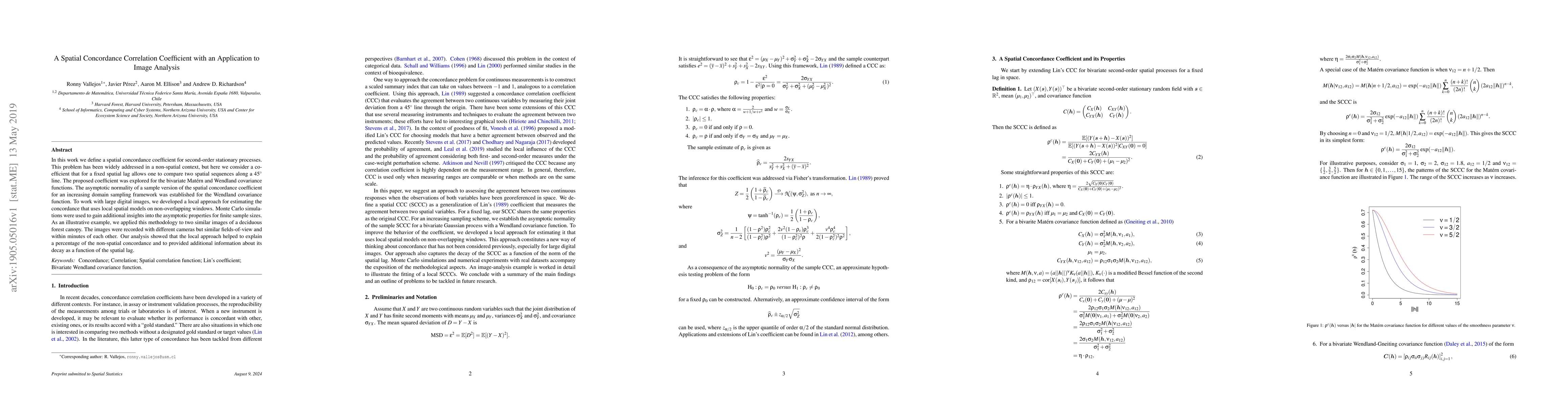 In this work we define a spatial concordance coefficient for second-order stationary processes. This problem has been widely addressed in a non-spatial context, but here we consider a coefficient that for a fixed spatial lag allows one to compare two spatial sequences along a 45-degree line. The proposed coefficient was explored for the bivariate Mat\'ern and Wendland covariance functions. The asymptotic normality of a sample version of the spatial concordance coefficient for an increasing domain sampling framework was established for the Wendland covariance function. To work with large digital images, we developed a local approach for estimating the concordance that uses local spatial models on non-overlapping windows. Monte Carlo simulations were used to gain additional insights into the asymptotic properties for finite sample sizes. As an illustrative example, we applied this methodology to two similar images of a deciduous forest canopy. The images were recorded with different cameras but similar fields-of-view and within minutes of each other. Our analysis showed that the local approach helped to explain a percentage of the non-spatial concordance and to provided additional information about its decay as a function of the spatial lag.
