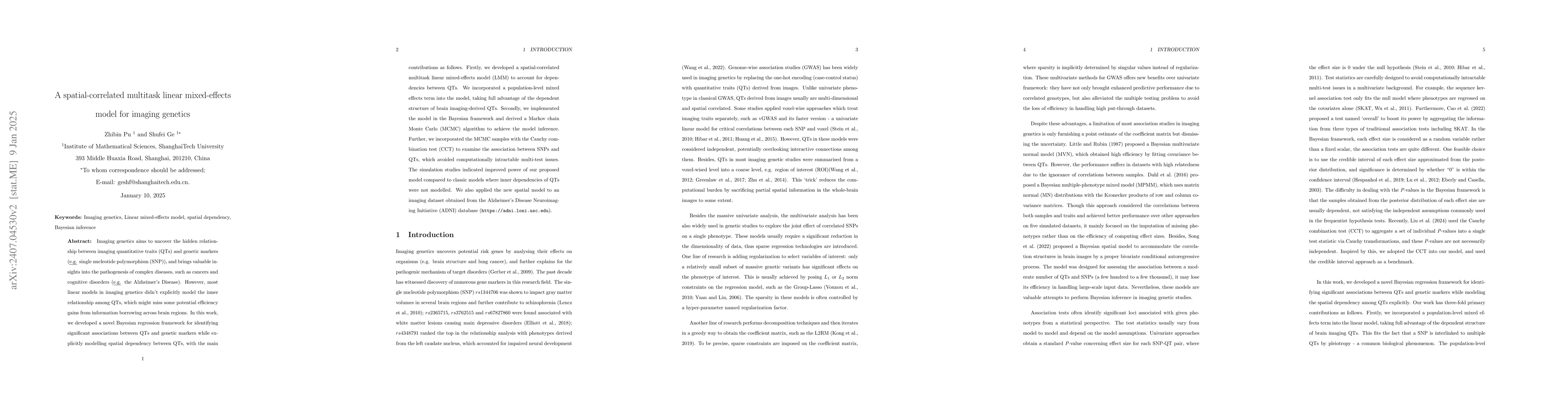 This paper introduces a Bayesian regression framework with a spatial-correlated multitask linear mixed-effects model to identify associations between imaging quantitative traits and genetic markers, emphasizing the modeling of spatial dependencies among imaging traits for improved efficiency. The proposed model uses a Markov chain Monte Carlo algorithm and the Cauchy combination test to handle multi-test issues, demonstrating better performance in simulations and an application to Alzheimer's Disease neuroimaging data.