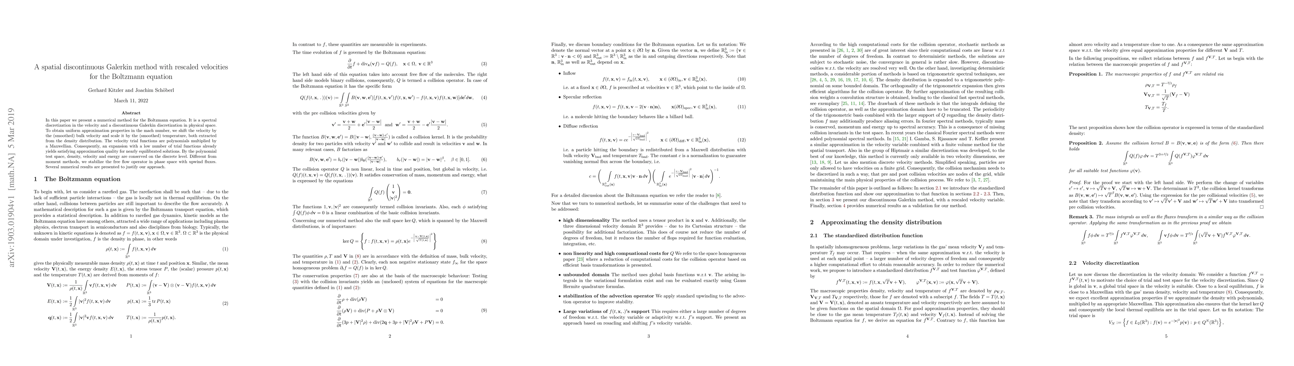 In this paper we present a numerical method for the Boltzmann equation. It is a spectral discretization in the velocity and a discontinuous Galerkin discretization in physical space. To obtain uniform approximation properties in the mach number, we shift the velocity by the (smoothed) bulk velocity and scale it by the (smoothed) temperature, both extracted from the density distribution. The velocity trial functions are polynomials multiplied by a Maxwellian. Consequently, an expansion with a low number of trial functions already yields satisfying approximation quality for nearly equilibrated solutions. By the polynomial test space, density, velocity and energy are conserved on the discrete level. Different from moment methods, we stabilize the free flow operator in phase space with upwind fluxes. Several numerical results are presented to justify our approach.