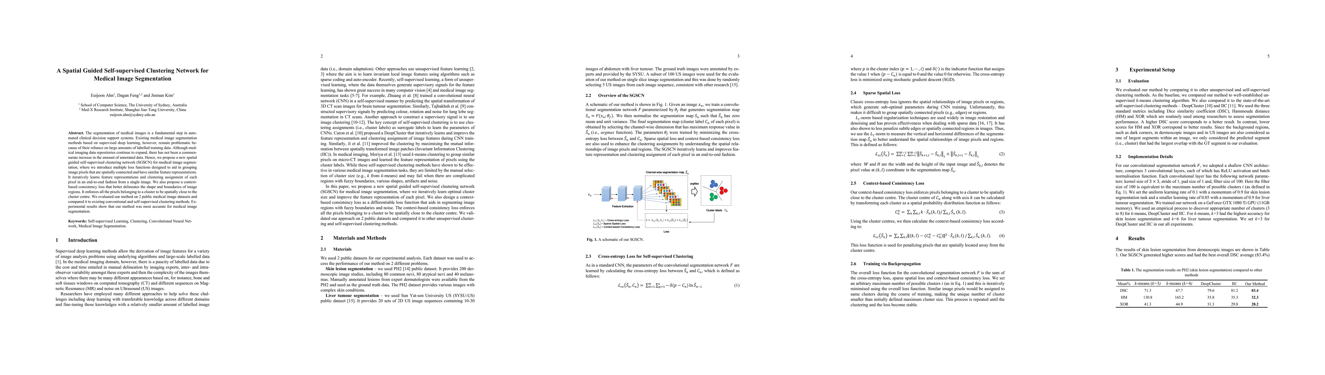This paper proposes a spatial guided self-supervised clustering network (SGSCN) for medical image segmentation, which leverages multiple loss functions to cluster spatially connected pixels without requiring large amounts of labeled training data. The method was shown to be more accurate than conventional and self-supervised clustering methods on two public datasets.