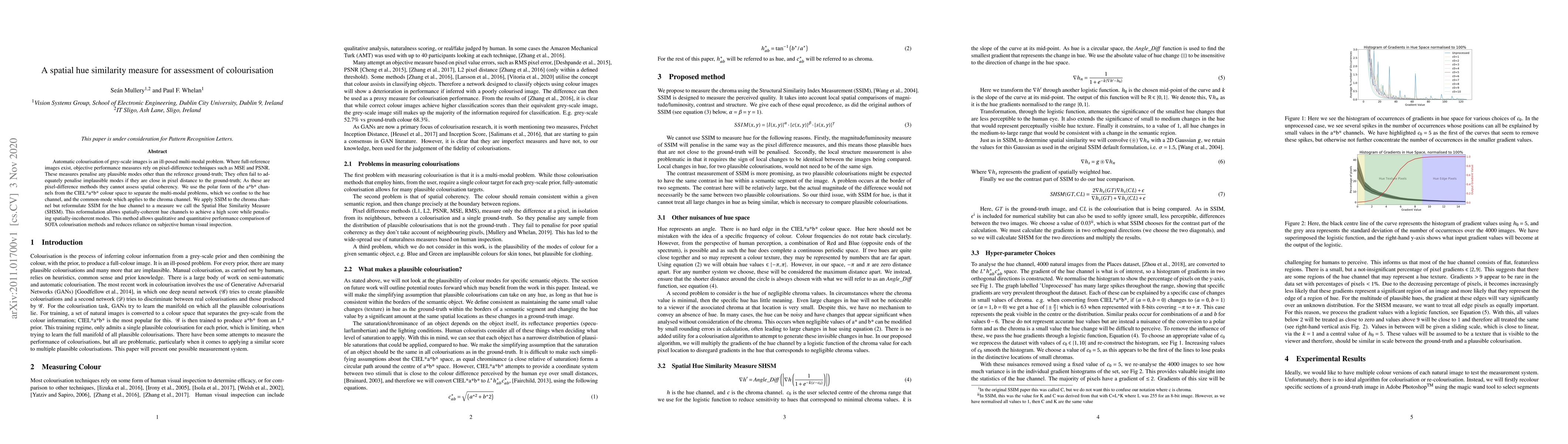 Automatic colourisation of grey-scale images is an ill-posed multi-modal problem. Where full-reference images exist, objective performance measures rely on pixel-difference techniques such as MSE and PSNR. These measures penalise any plausible modes other than the reference ground-truth; They often fail to adequately penalise implausible modes if they are close in pixel distance to the ground-truth; As these are pixel-difference methods they cannot assess spatial coherency. We use the polar form of the a*b* channels from the CIEL*a*b* colour space to separate the multi-modal problems, which we confine to the hue channel, and the common-mode which applies to the chroma channel. We apply SSIM to the chroma channel but reformulate SSIM for the hue channel to a measure we call the Spatial Hue Similarity Measure (SHSM). This reformulation allows spatially-coherent hue channels to achieve a high score while penalising spatially-incoherent modes. This method allows qualitative and quantitative performance comparison of SOTA colourisation methods and reduces reliance on subjective human visual inspection.