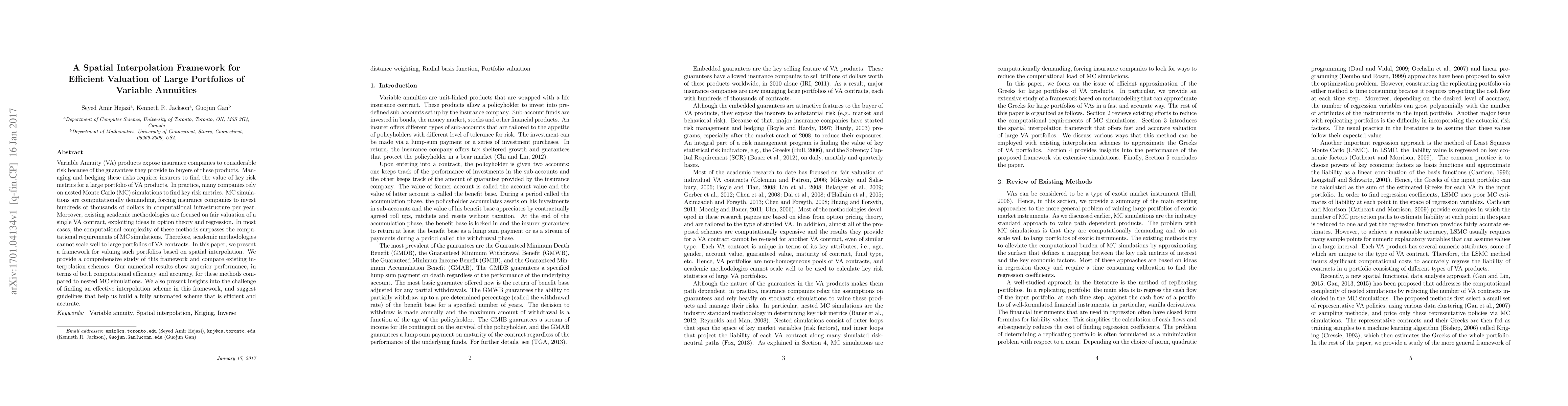 Variable Annuity (VA) products expose insurance companies to considerable risk because of the guarantees they provide to buyers of these products. Managing and hedging these risks requires insurers to find the value of key risk metrics for a large portfolio of VA products. In practice, many companies rely on nested Monte Carlo (MC) simulations to find key risk metrics. MC simulations are computationally demanding, forcing insurance companies to invest hundreds of thousands of dollars in computational infrastructure per year. Moreover, existing academic methodologies are focused on fair valuation of a single VA contract, exploiting ideas in option theory and regression. In most cases, the computational complexity of these methods surpasses the computational requirements of MC simulations. Therefore, academic methodologies cannot scale well to large portfolios of VA contracts. In this paper, we present a framework for valuing such portfolios based on spatial interpolation. We provide a comprehensive study of this framework and compare existing interpolation schemes. Our numerical results show superior performance, in terms of both computational efficiency and accuracy, for these methods compared to nested MC simulations. We also present insights into the challenge of finding an effective interpolation scheme in this framework, and suggest guidelines that help us build a fully automated scheme that is efficient and accurate.