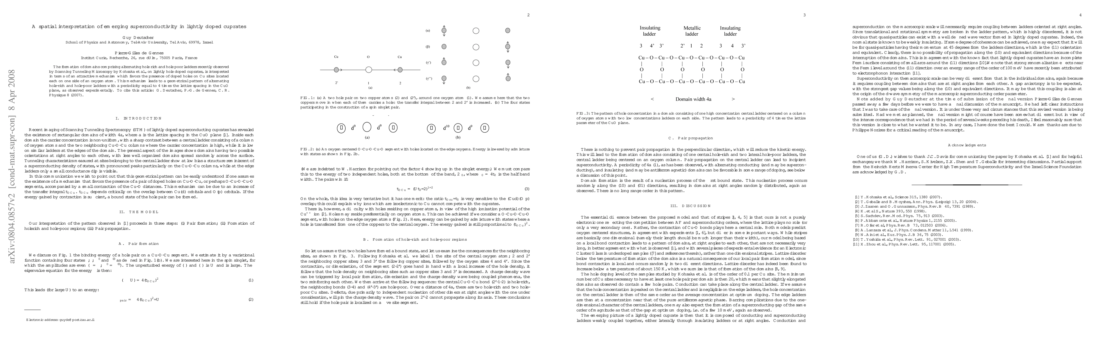 The formation of domains comprising alternating 'hole rich' and 'hole poor' ladders recently observed by Scanning Tunneling Microscopy by Kohsaka et al., on lightly hole doped cuprates, is interpreted in terms of an attractive mechanism which favors the presence of doped holes on Cu sites located each on one side of an oxygen atom. This mechanism leads to a geometrical pattern of alternating hole-rich and hole-poor ladders with a periodicity equal to 4 times the lattice spacing in the CuO plane, as observed experimentally. To cite this article: G. Deutscher, P.-G. de Gennes, C. R. Physique 8 (2007).
