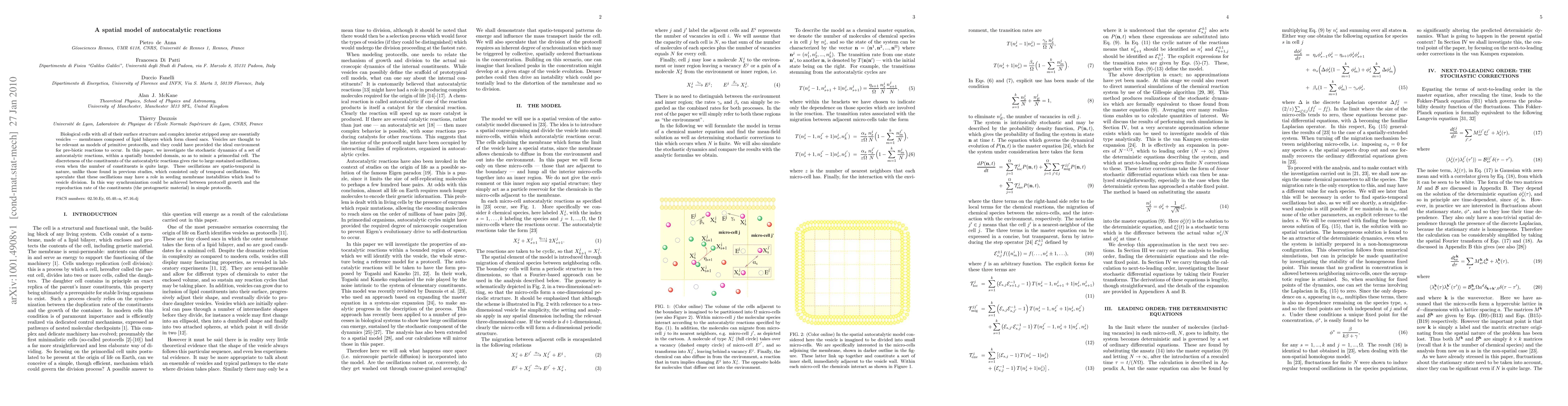 This paper explores the stochastic dynamics of autocatalytic reactions within a spatially bounded domain to model primitive protocells. It finds large sustained spatio-temporal oscillations in the reactions, which may seed membrane instabilities leading to vesicle division and synchronization between protocell growth and reproduction.