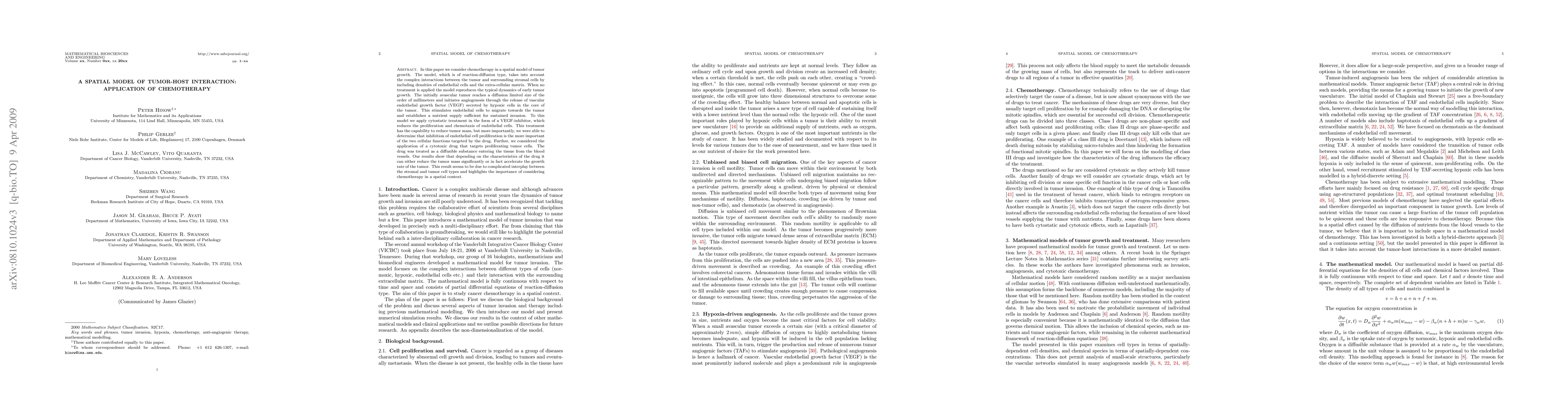 A spatial model of tumor-host interaction simulates chemotherapy effects on tumor growth, showing that inhibiting endothelial cell proliferation is key to reducing tumor mass, while certain cytotoxic drugs can either reduce or accelerate tumor growth depending on their characteristics.
