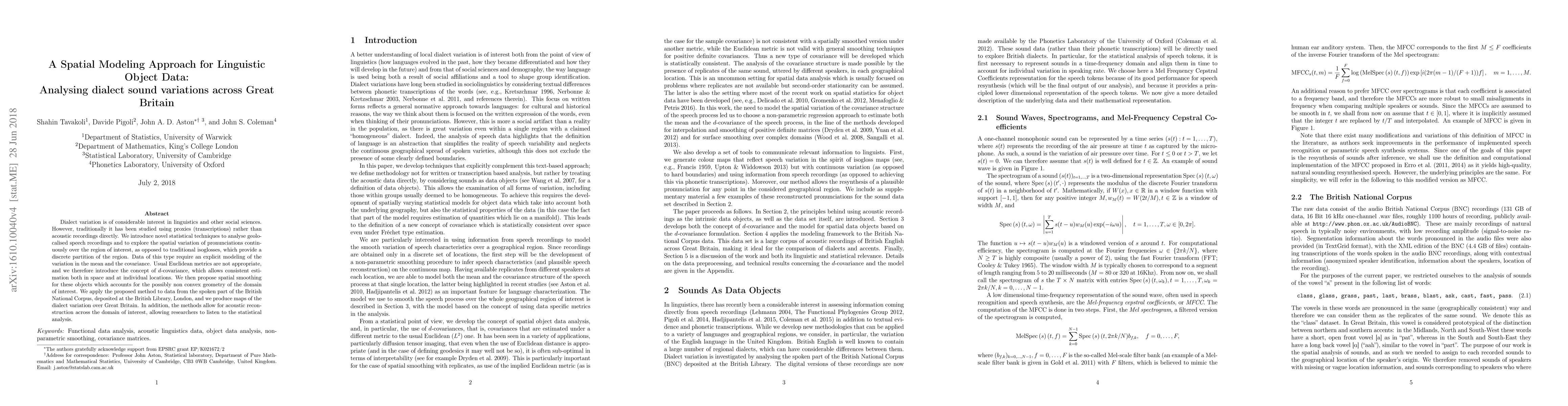 Dialect variation is of considerable interest in linguistics and other social sciences. However, traditionally it has been studied using proxies (transcriptions) rather than acoustic recordings directly. We introduce novel statistical techniques to analyse geolocalised speech recordings and to explore the spatial variation of pronunciations continuously over the region of interest, as opposed to traditional isoglosses, which provide a discrete partition of the region. Data of this type require an explicit modeling of the variation in the mean and the covariance. Usual Euclidean metrics are not appropriate, and we therefore introduce the concept of $d$-covariance, which allows consistent estimation both in space and at individual locations. We then propose spatial smoothing for these objects which accounts for the possibly non convex geometry of the domain of interest. We apply the proposed method to data from the spoken part of the British National Corpus, deposited at the British Library, London, and we produce maps of the dialect variation over Great Britain. In addition, the methods allow for acoustic reconstruction across the domain of interest, allowing researchers to listen to the statistical analysis.