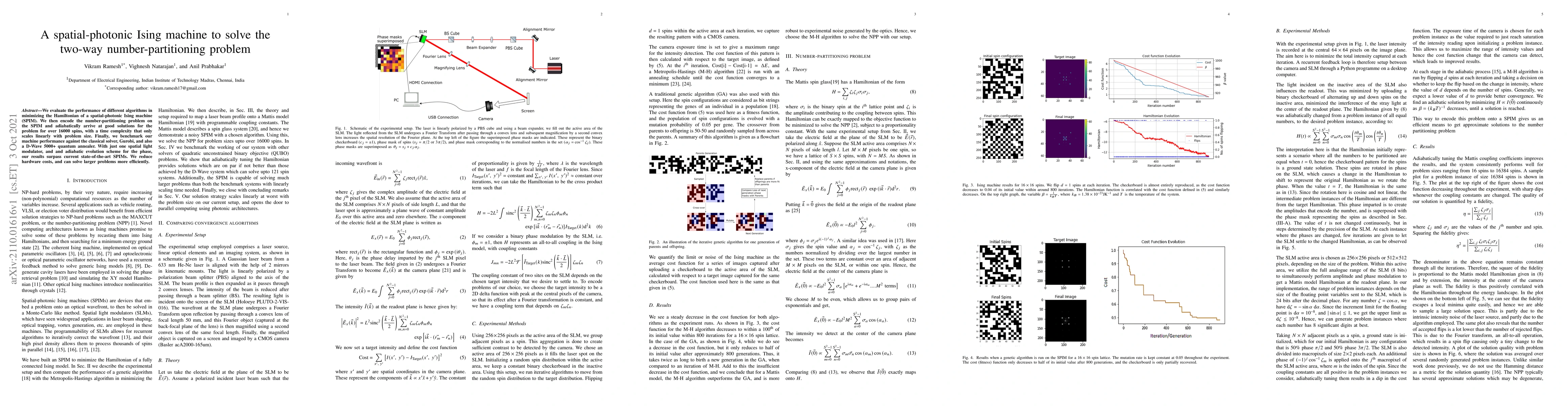 This paper presents a spatial-photonic Ising machine (SPIM) that efficiently solves the number-partitioning problem with linear time complexity relative to problem size, outperforming classical and quantum solvers. The SPIM uses a single spatial light modulator and adiabatic evolution, reducing hardware costs and enabling efficient handling of larger problems.